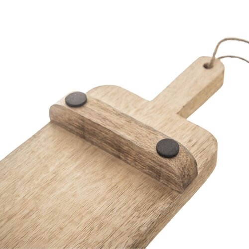 Väčšia hranatá doštička z mangového dreva, so špecifickou, výraznou kresbou bude štýlovým doplnkom na kuchynský stôl. Veľkú parádu urobí aj na záhradnej párty, grilovačke, zvlášť keď na ňu položíte taniere s poriadnymi kusmi mäsa a grilovanej zeleniny, doplnené miskami s dipmi a dochucovadlami. Doladí tak hrejivú atmosféru vášho bývania, napríklad spoločne s ostatnými kúskami z mangového dreva. Je možné ju aj zavesiť za jutový povrázok na rukoväti, bude tak štýlovou dekoráciou doma aj na chalupe.Dobre sa prenáša vďaka vyvýšenej doštičke, navyše má protišmykové podložky zo spodnej strany. Pri znečistení ju stačí utrieť vlhkou handričkou, nenamáčať, a raz za čas ju natrieť jedlým olejom. Je možné, že po tomto procese mangové drevo stmavne a zvýrazní sa kresba dreva.