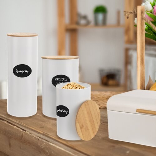 Dobre uskladnené potraviny, ktoré si uchovajú svoju kvalitu, nezvlhnú a nevysypú sa, sú základom prípravy jedál i nápojov. Preto je tu hladká biela plechová dóza s objemom 2300 ml s bambusovým viečkom so silikónovým tesnením. Do nej je možné uložiť ako müsli, sušené ovocie a cereálie, tak aj ryžu, cestoviny, strúhanku, celé balenie múky alebo strukovín. A v dielni alebo detskej izbe sa dovnútra zmestia šijacie potreby, drobné náradie aj výtvarné potreby.