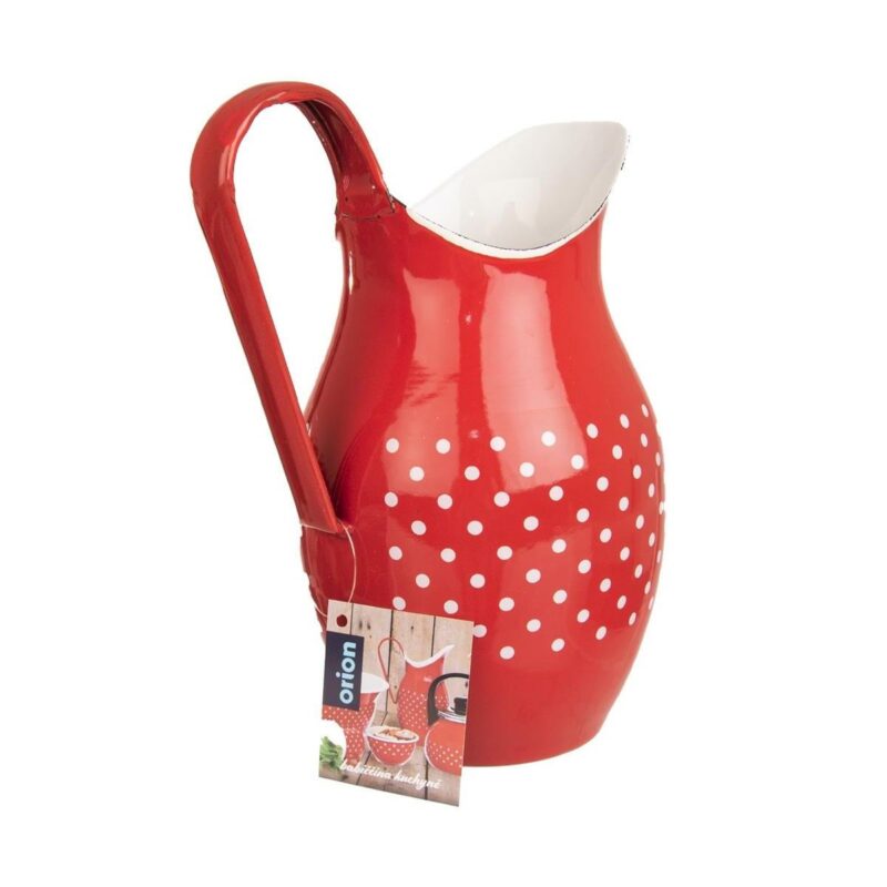 Elegantný džbán s uchom s objemom 2,5 litra má povrchovú úpravu z kvalitného smaltu. Veľmi elegantný tvar zvýrazňuje červená farba s bielymi bodkami. Výška džbánu 26 cm.