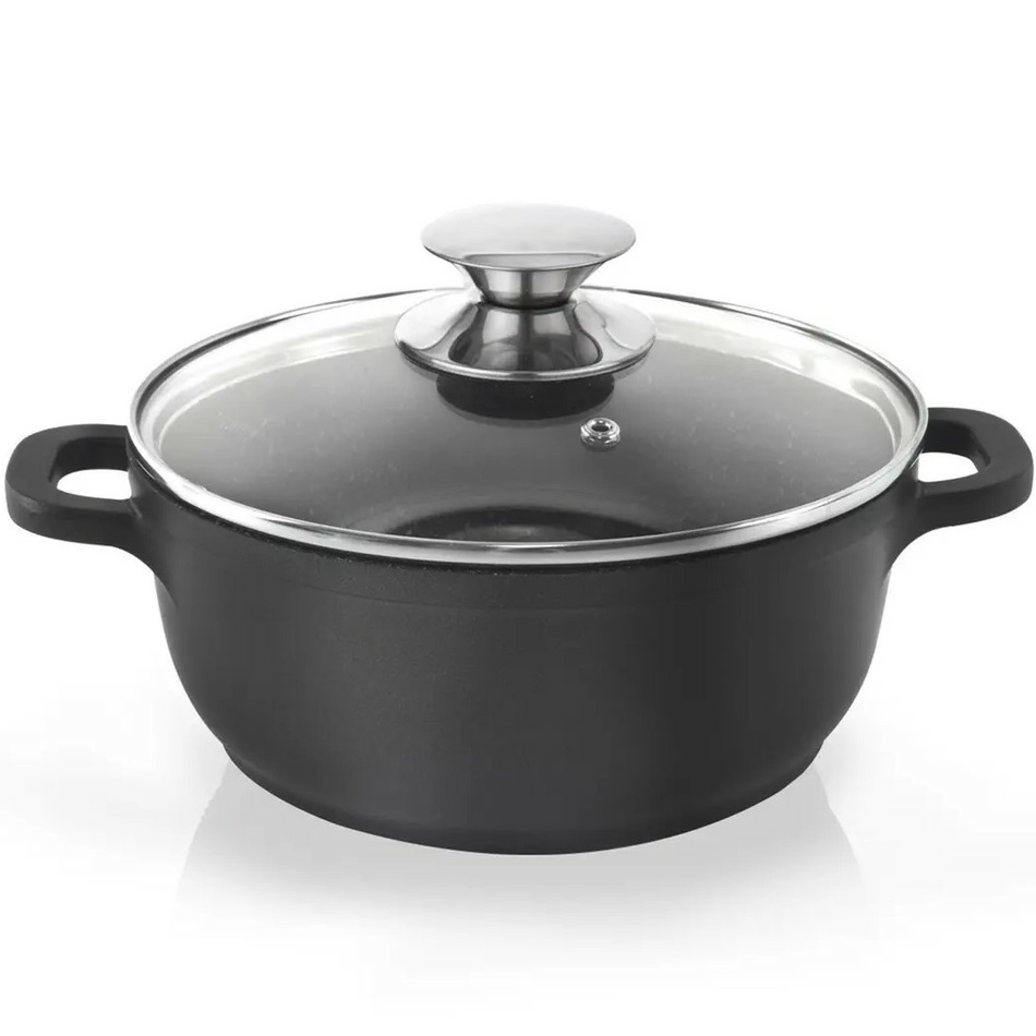 Masívny hrniec s pokrievkou s veľmi kvalitným nepriľnavým povrchom Pfluon Granit. Môžete v ňom variť, smažiť, dusiť, opekať a zapekať s minimálnou potrebou tuku. Pripravovaný pokrm sa nepripeká. Hrniec je dodávaný s pokrievkou s otvorom pre únik prebytočnej pary. Vhodný na všetky typy spotrebičov vrátane indukcie. V rúre používajte bez pokrievky. Materiál: hliník s vynikajúcim nepriľnavým povrchom a s profilovaným dnom. Výška bez pokrievky 8,5 cm.