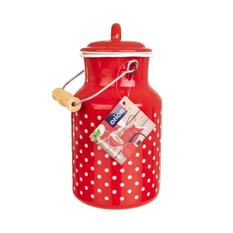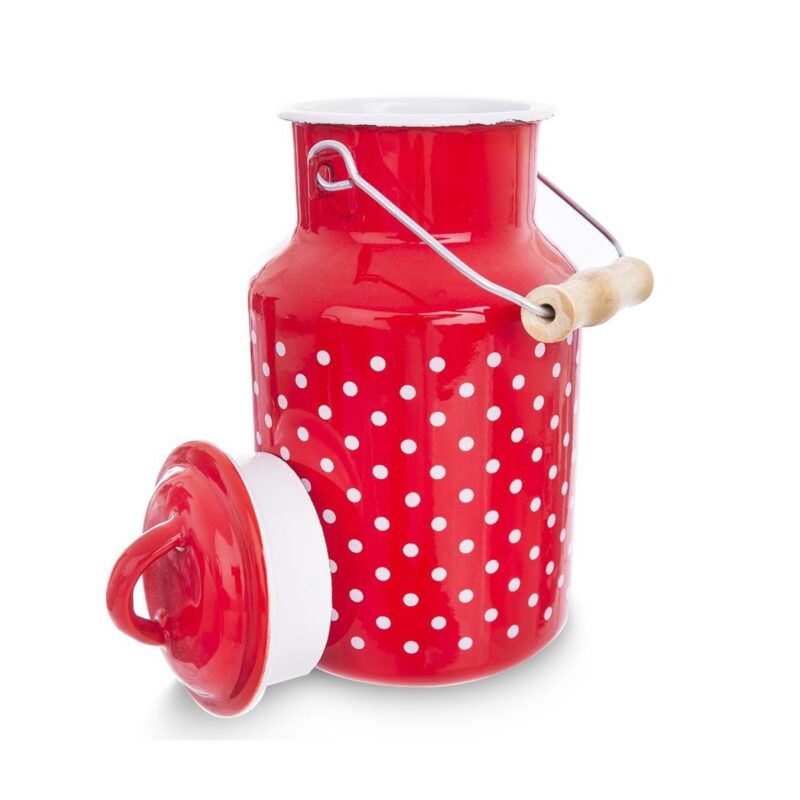 Kvalitná smaltovaná bandaska na mlieko s pokrievkou a uchom je vo veselom červenom prevedení s bielymi bodkami. Poslúži na prenášanie a prevoz mlieka, polievok a ostatných tekutín.