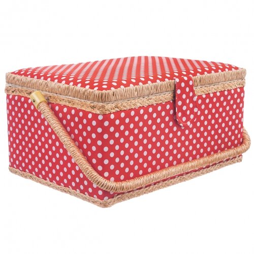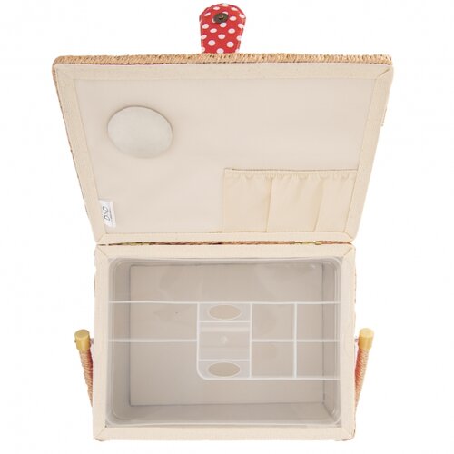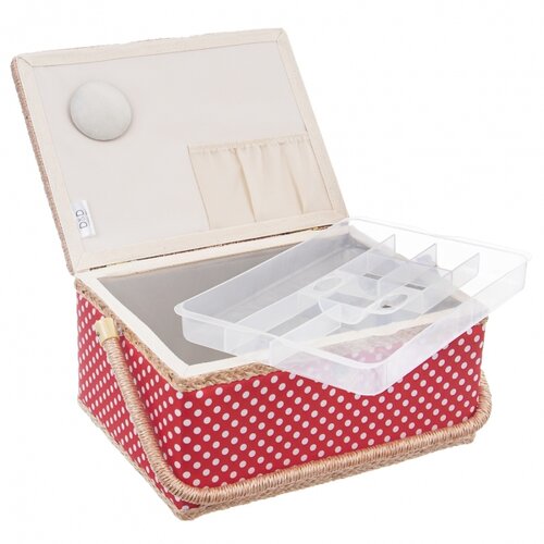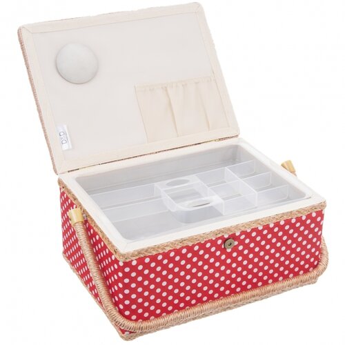 Polstrovaná kazeta s priehradkou vám pomôže prehľadne uložiť všetky vaše šijacie potreby alebo iné drobnosti – potreby na vyšívanie, navliekanie korálikov, drôtkovanie a iné kreatívne vyrábanie.Vo vnútri dreveného čalúneného boxu sa nachádza odnímateľné poschodie z priehľadného pevného plastu, ktoré má tri menšie a jednu väčšiu priehradku. Na vnútornej strane veka je vrecko a tzv. piškóta – ihelníček.Box s veľkosťou 24/28,5 x 18/20 x 13 cm je opatrený sklápacím uchom pre ľahké prenášanie jednou rukou a zatváraním na magnet. Vnútorný priestor 21 x 15 x 10 cm tak ocenia aj začínajúce krajčírky na uloženie nití, patentov, gombíkov, lemoviek a ďalších šijacích potrieb.