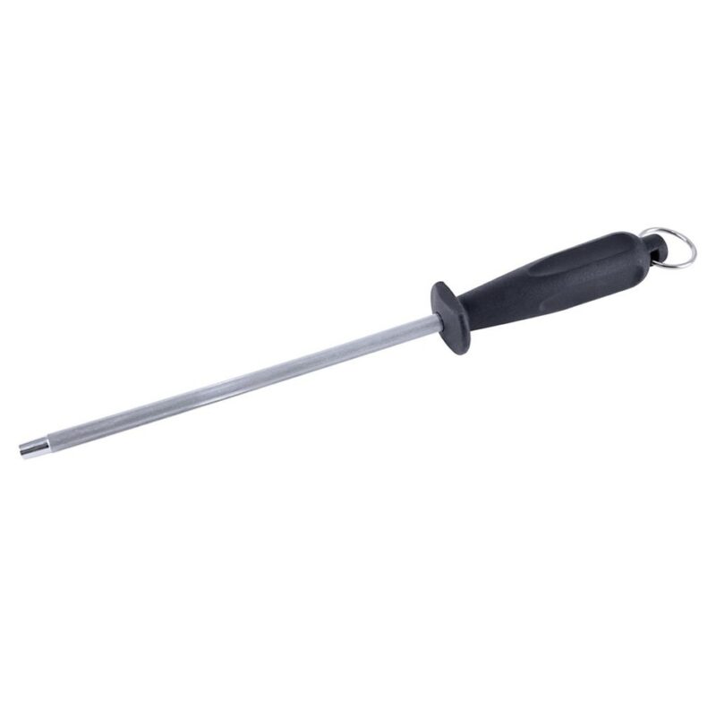 Ocieľka na brúsenie kuchynských nožov. Plastová rukoväť, kovové oko na zavesenie.Materiál: nehrdzavejúca oceľ, plast. Rozmery: celková dĺžka 33 cm.