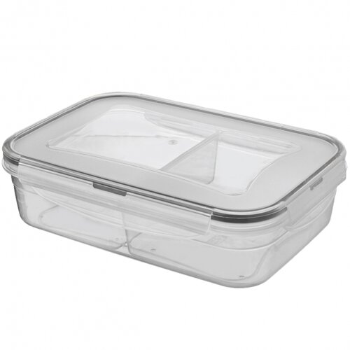 Transparentná plastová dóza so silikónovým tesnením vo viečku a s klipmi na pevné uzavretie poslúži na uloženie potravín v chladničke aj mrazničke, ale bude sa hodiť aj na prenášanie obeda do práce alebo desiaty na výlety s partnerom alebo rodinou. A ak sa chystáte na piknik alebo záhradnú párty, je možné do nej uložiť aj drobné chuťovky alebo zeleninu.Vo vnútri sú 2 menšie misky, ktoré zaistia oddelenie potravín. Dajú sa ale tiež vybrať a dózu použiť bez nich. Dóza je stohovateľná, je možné ju použiť bez viečka na ohrev v mikrovlnnej rúre a umývať v umývačke. Znesie teploty od -25 do +95 °C. Celkový objem 1 l, objem jednotlivých mištičiek je 0,4 l.