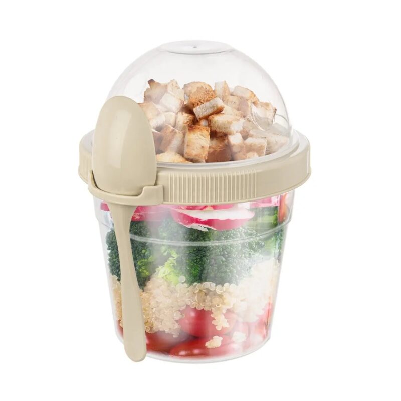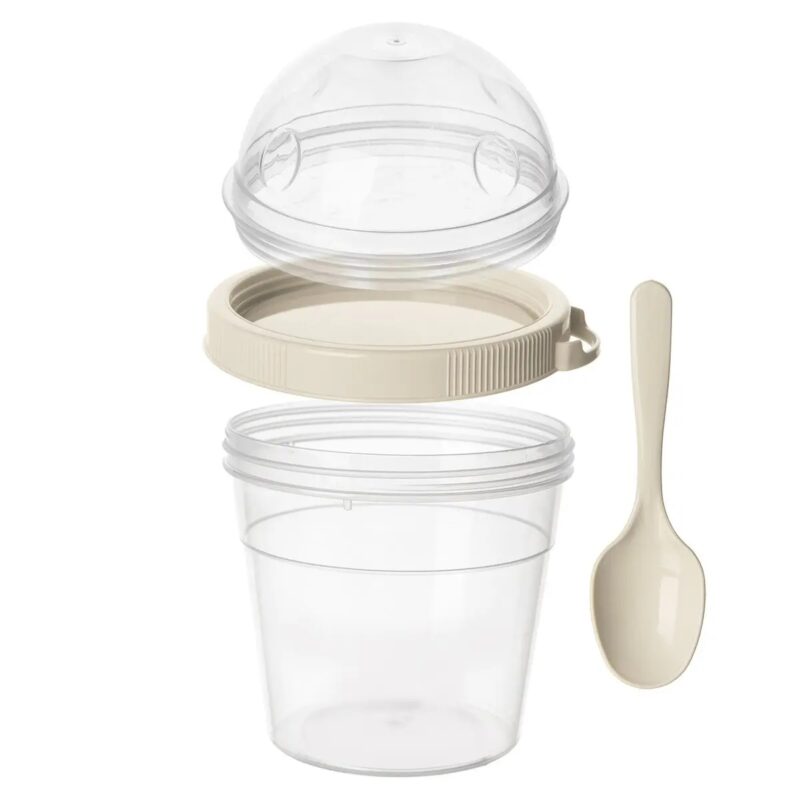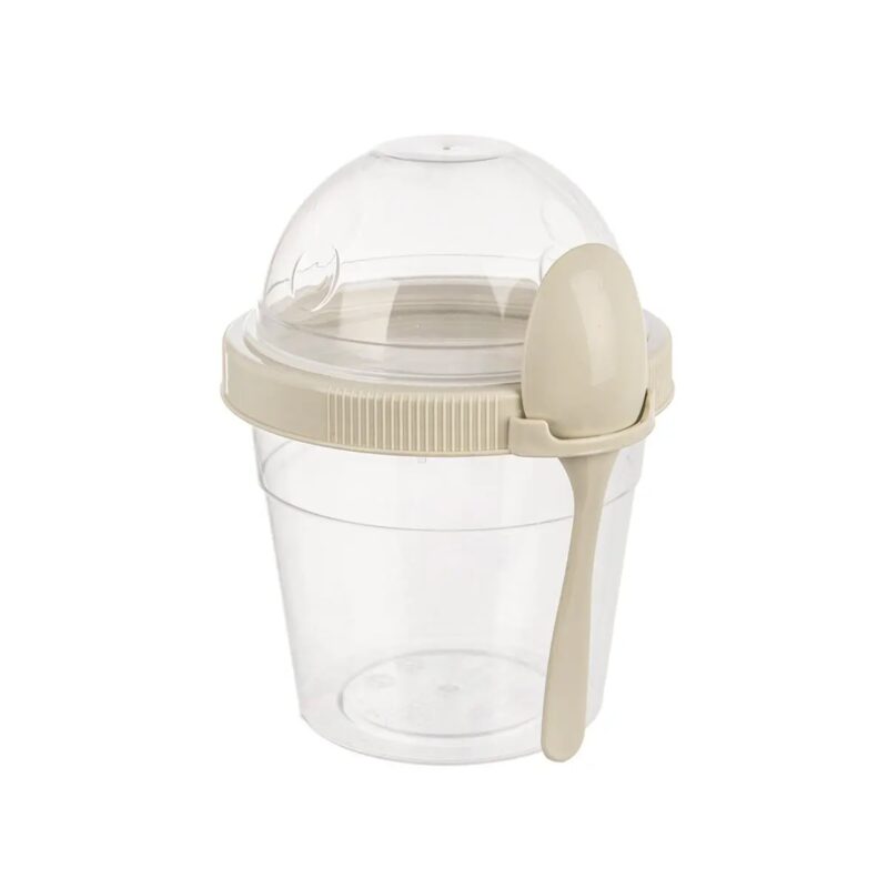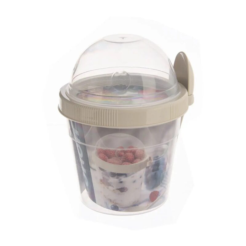 Tento šikovný priehľadný pohár s objemom 500 ml bude ideálnym pre vašu desiatu. Je delený na spodnú a hornú časť, ktoré je možné naskrutkovať na béžové viečko so závitom z oboch strán. Súčasťou balenia je aj lyžička v béžovej farbe.Vhodný na uloženie jogurtu, výživy, šalátov či čerstvého ovocia, hore do viečka s objemom 0,22 l potom možno vložiť müsli, cereálie, lupienky alebo piškóty.Pohár z plastu PP znesie aj krátky ohrev v mikrovlnnej rúre (bez viečka) a teploty od -25 do +25 °C, takže do neho môžete naliať aj studené gazpacho a krutóny, cestovinový, ryžový šalát alebo dip či dresing.Po použití ho je možné umyť aj v umývačke.