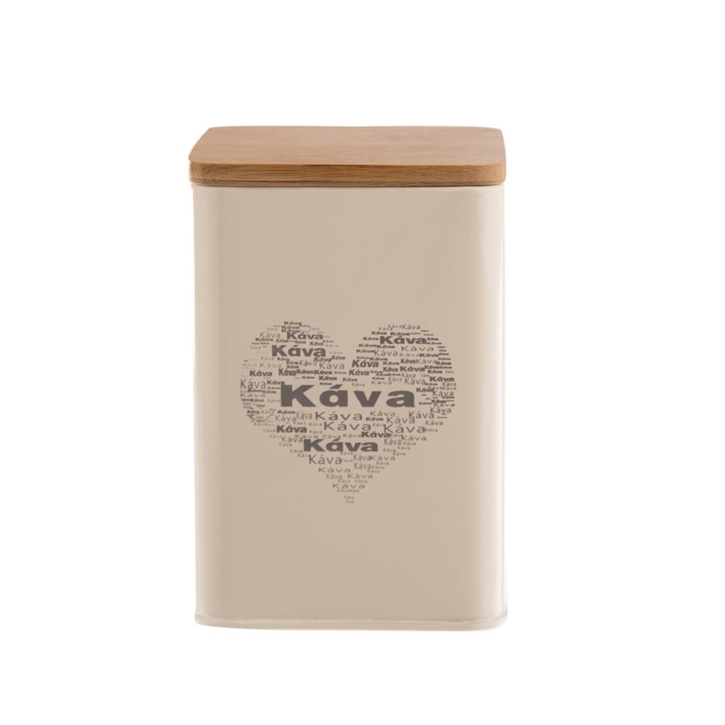 Plechová hranatá dóza s dreveným viečkom je vhodná na uloženie kávy. Dóza s jemným dekorom srdiečka je nielen praktická, ale zároveň aj pekná dekorácia v interiéri.