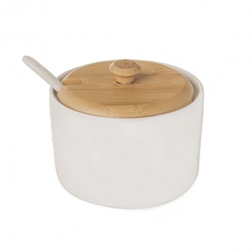 Elegantná, biela cukornička s bambusovým viečkom a porcelánovou lyžičkou sa hodí do klasickej, modernej aj rustikálnej kuchyne. Spoločne s bielymi šálkami a podšálkami podčiarkne táto cukornička príjemný dojem zo stolovania. Má praktické viečko s výrezom. Navyše ju bez viečka je možné umývať v umývačke riadu.