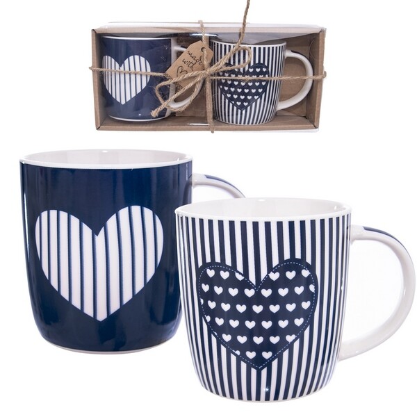 Sada porcelánových hrnčekov, ktoré sú dekorované jemným vzorom srdca, bude pekným doplnkom interiéru kuchyne. Balenie obsahuje dva hrnčeky, každý s iným dekorom. Hrnčeky balené v peknej darčekovej krabičke budú aj milým darčekom pre vašich najbližších.