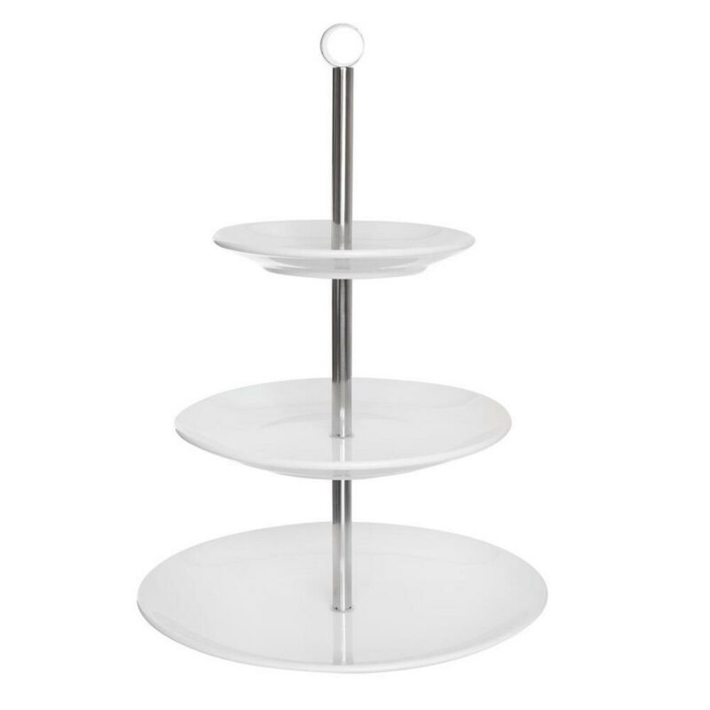Trojposchodový okrúhly stojan na servírovanie zákuskov, cukroviniek, ovocia, jednohubiek aj chlebíčkov. Čisto biely porcelán zaistí stojanu krásny vzhľad a hladký povrch. Doplnený rúčkou pre pohodlné prenášanie. Materiál: porcelán, zliatina zinku. Priemery tanierov: 15,5 cm, 20,5 cm a 25,5 cm.
