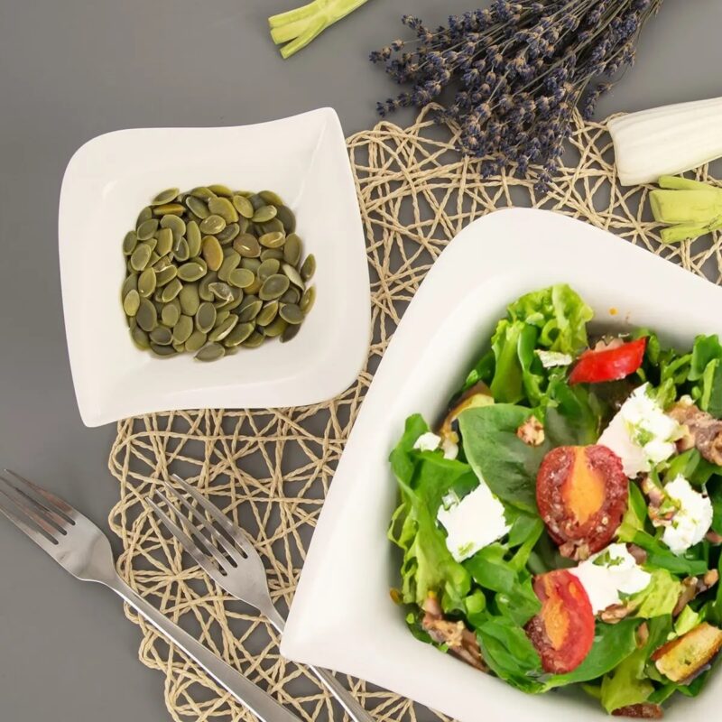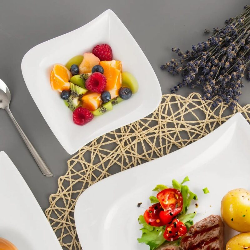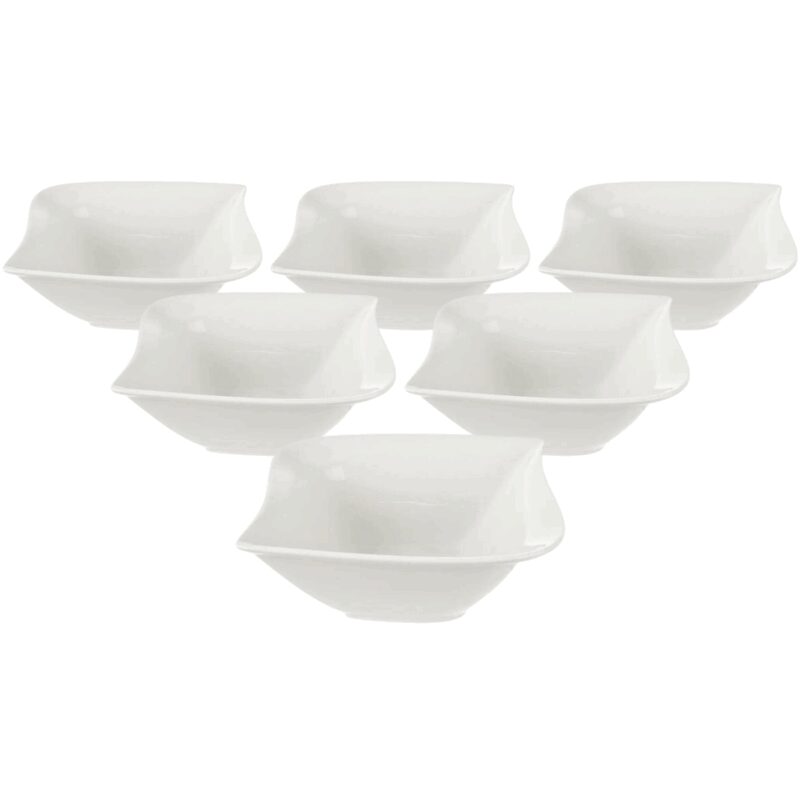 Súprava 6 hranatých misiek z veľmi kvalitného porcelánu Mona Musica, s rozmermi 13,7 x 13,7 x 5,3 cm a objemom 400 ml, sa vďaka nevšednému tvaru a modernému riešeniu okrajov hodí k bežnému aj sviatočnému stolovaniu.Hodí sa na servírovanie drobného čerstvého ovocia, kompótov, raňajkových kaší, zmrzliny i šalátov. A pri rodinom stretnutí alebo párty v záhrade ich možno naplniť olivami, orieškami či rôznymi dipmi.Je možné ich použiť aj v mikrovlnnej rúre a umývať v umývačke riadu.