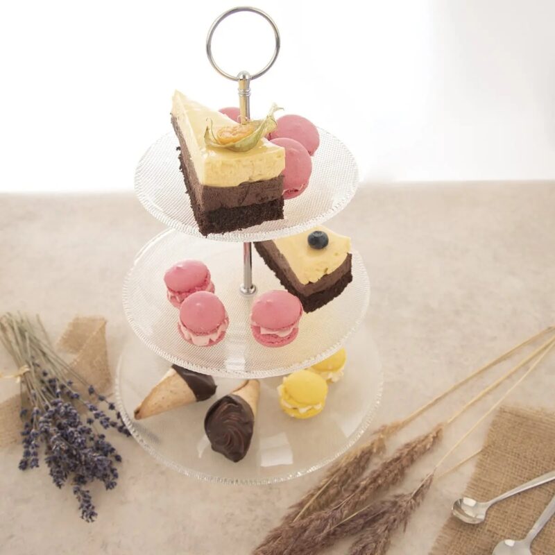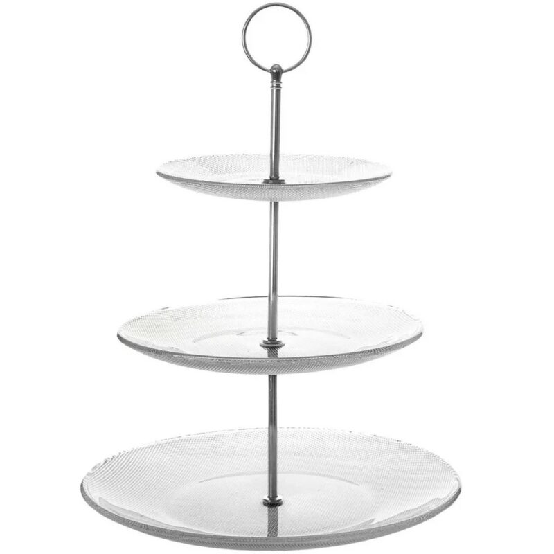 Či už organizujete rodinnú oslavu alebo posedenie s priateľmi, umiestnite vybrané dobroty do tohto trojposchodového stojana z kolekcie EMA. Hodí sa na zákusky, koláčiky, pečivo, ovocie i jednohubky. Tvorí ho kovové držadlo s okrúhlym zakončením, ktoré uľahčuje jeho prenášanie.Ďalej má tri sklenené taniere, ktoré majú priemer 15, 20 a 25 cm. Jednoduchý, ale elegantný dizajn v kombinácii s použitým materiálom ladí k takmer každej kuchynskej súprave.