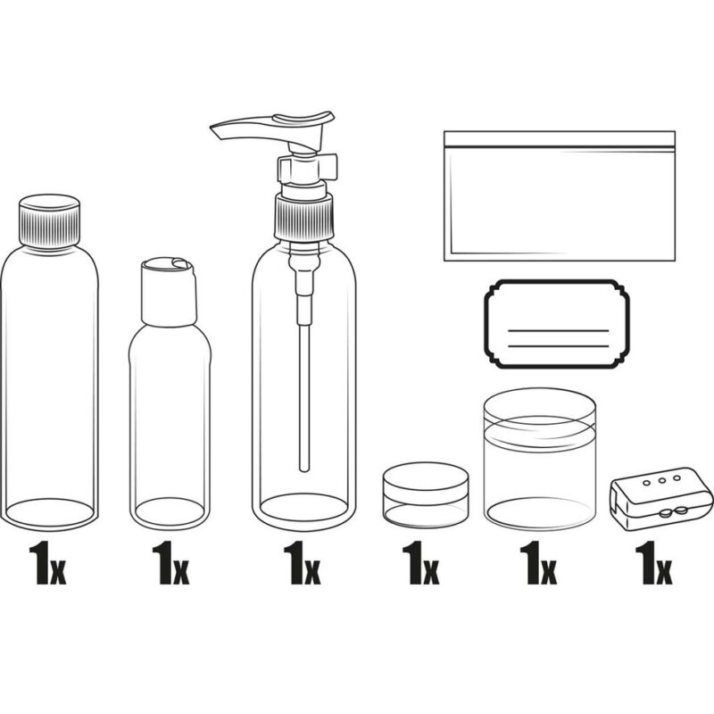 Súprava fľaštičiek v uzatvárateľnom puzdre, ktoré využijete pre deti na tábor, viacdenný výlet, služobnú cestu, … Zo svojich obľúbených kozmetických prípravkov si vezmete len potrebné množstvo a ušetríte miesto v batožine. Tento cestovný set spĺňa kritériá pre batožinu do lietadla (maximálny objem 100 ml, fľaštičky i taška sú z priehľadného plastu). Vhodné pre prevážanie šampónov, krémov, gélov, voňaviek a iných hygienických pomôcok.Opakovane uzatvárateľné priehľadné puzdro obsahuje: