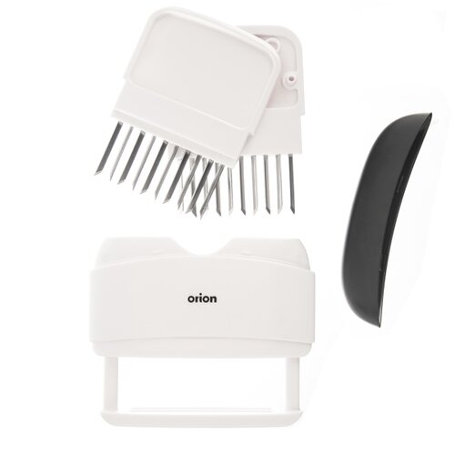 Tenderizér je vynikajúci pomocník pri príprave šťavnatých steakov, zvláčni všetky druhy červeného mäsa. A ako na to? Tenderizér stačí položiť na plátok surového mäsa, zatlačiť na rukoväť a tento postup opakovať po celej ploche steaku. Ostré nehrdzavejúce čepele zjemnia vo chvíľke štruktúru mäsa. To prispieva k rovnomernému a rýchlejšiemu prepečeniu mäsa. Ak sa mäso marinuje, vďaka procesu tenderizácie preniká marináda lepšie do mäsa, marinovanie je kratšie a účinnejšie. Aj doma tak dosiahnete profesionálne výsledky. Snímateľný kryt čepelí zaisťuje bezpečné uloženie.