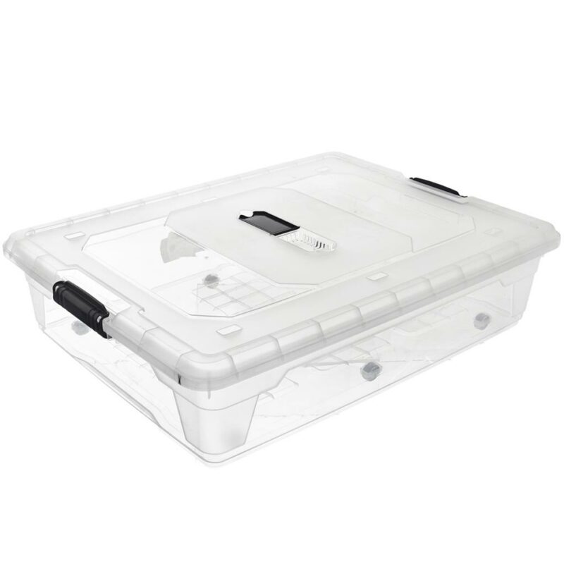 Úložný box s vekom je ideálnym a praktickým pomocníkom do každej domácnosti. Svoje uplatnenie nájde doma, na chalupe alebo chate. Transparentný box vám pomôže udržať prehľad a poriadok. Vďaka praktickému transparentnému veku ochránite uložené veci pred prachom a zabránite vysypaniu obsahu boxu. Kolieska po stranách boxu uľahčia jeho premiestňovanie.