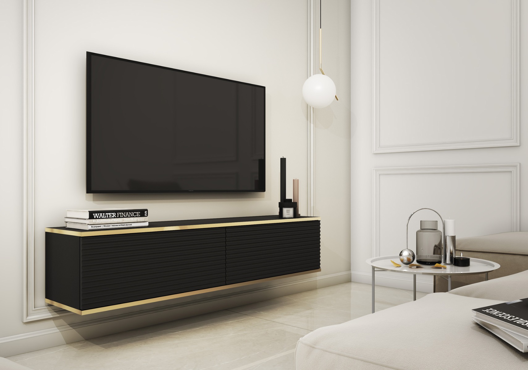 Moderný TV stolík ORLANDO sa stane pýchou každej obývačky. Zavesením na stenu v miestnosti pôsobí vzdušne a nadčasovo. Pre produkt boli použité módne farby a odolné materiály. Je vybavený dvoma priehradkami, ktoré poskytujú priestor pre rôzne typy elektronických zariadení a ďalšie príslušenstvo. Tiché a jemné otváranie dvierok zabezpečí push to open systém, stačí len zľahka zatlačiť na čelo nábytku. Zaujímavé drážkované predné čelá so zlatým lemovaním tento produkt odlišujú od ostatných TV stolíkov a v miestnosti tak pôsobí luxusne a štýlovo. Farebné prevedenie: čiernaMateriál: MDF doska vystužená ABS hranouROZMERY: Hĺbka: 32 cmŠírka: 135 cmVýška: 30 cmDodávame v demonte.