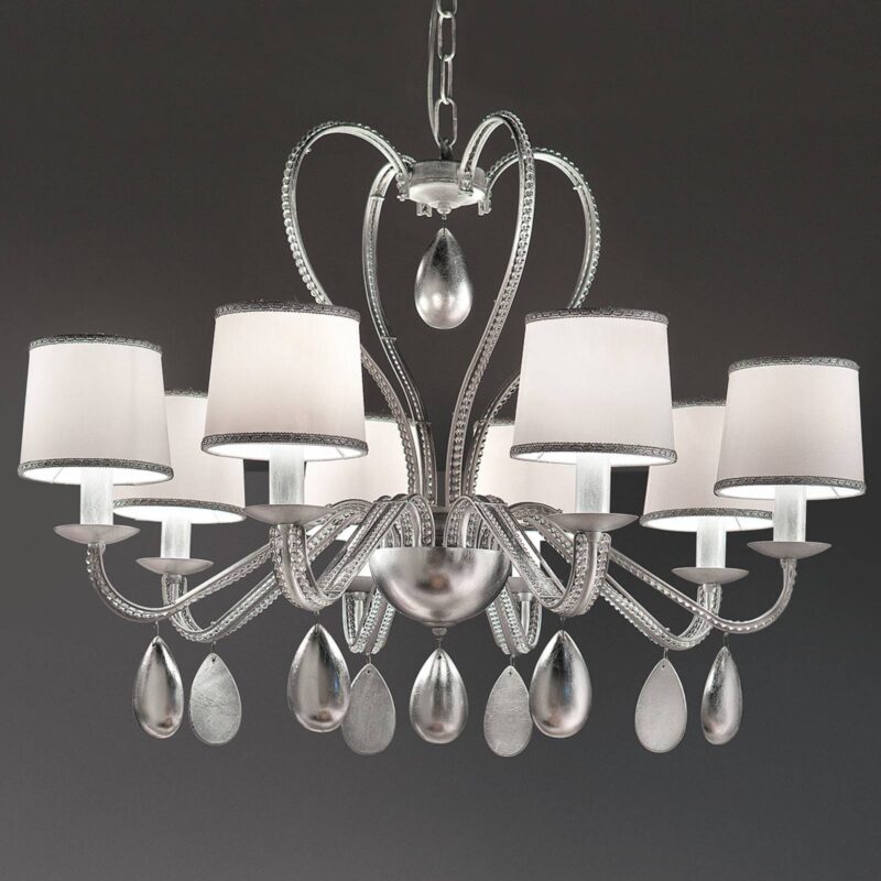 Ušľachtilý visiace lustre Anouk v striebornej a bielej farbe, 8-pl. Osem bielych odtieňov lustra Anouk je vyrobených z jemnej látky Shantung a sú ohraničené strieborným okrajom v hornej a dolnej časti. Unikátny rám lustra vyrobený z plochých kovových ramien s ozdobným reliéfom dostal strieborno-bielu povrchovú úpravu, aby vznikla ušľachtilá kombinácia s bielymi odtieňmi. Závesy vyrobené z kovových prvkov v tvare slzy boli pokryté strieborným listom a tvoria spodný koniec lustra. Osemplamenový visiace lustre Anouk vyrobený z kovu osvetľuje napríklad jedálenský stôl, ale je tiež reprezentatívnym zdrojom svetla pre gastronomické oblasti alebo hotelierstvo. Anouk visiace lustre bol vyrobený v Taliansku známy výrobca, ktorých produkty sú charakteristické svojou výlučnosť a elegancie okrem prvotriednej kvality a najlepšie spracovanie a predstavujú reprezentatívne svetelné kreácie pre súkromné a komerčné priestory.