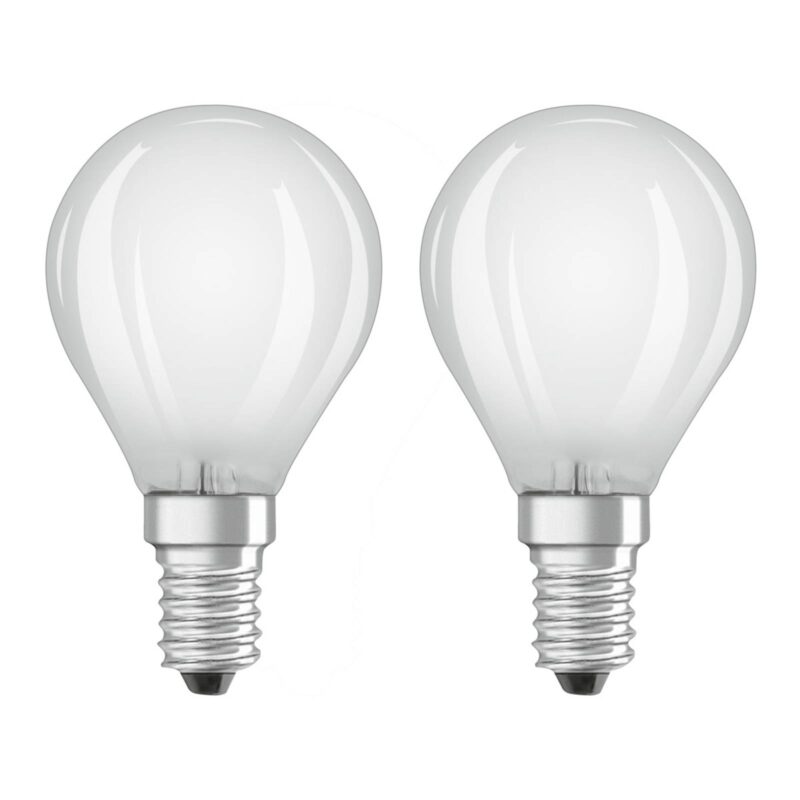 LED kvapková žiarovka Star Classic P od spoločnosti OSRAM 4 W, 2 700 K, matná v dvojitom balení Táto LED kvapková žiarovka s teplou bielou farbou svetla nahrádza 40W žiarovku a vďaka svojmu kompaktnému tvaru je obzvlášť vhodná na použitie v svietidlách s malým tienidlom. Technické údaje / vlastnosti: – porovnávacia hodnota žiarovky 40W – nie je stmievateľná