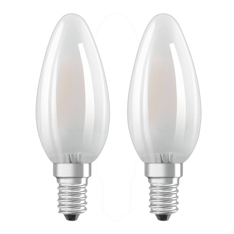 Sviečka E14 LED Star Classic B od spoločnosti OSRAM 4 W, 2 700 K, matná v dvojitom balení Jas a farba svetla tejto sviečky LED s matným sklom sú porovnateľné so žiarovkou s výkonom 40 W, ale so spotrebou energie 4 W si vyžaduje len desatinu energie a má aj oveľa dlhšiu životnosť. Technické údaje / vlastnosti: – porovnávacia hodnota žiarovky 40W – nie je stmievateľná