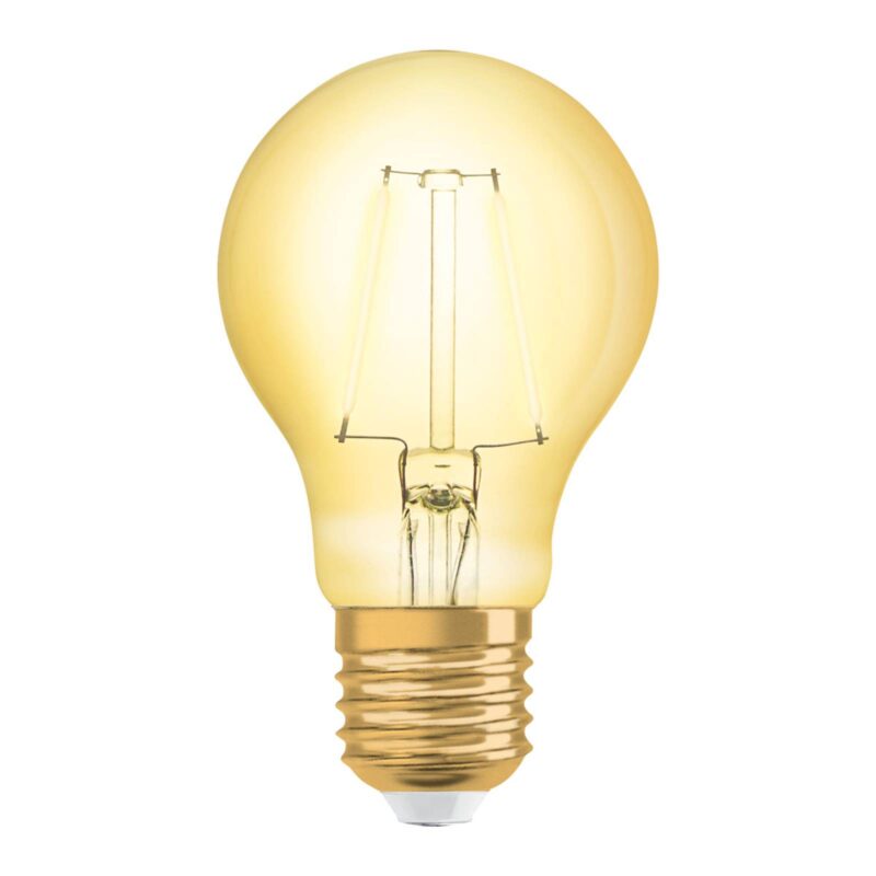 Zlatá LED žiarovka E27 Vintage Edition 1906 Classic A 2,5 W 2 400 K Táto LED žiarovka od spoločnosti OSRAM z edície Vintage Edition poskytuje útulné dekoratívne svetlo vo farbe svetla teplá biela s 2 400 K. Žiarovka so žiarovkou zo zlatého skla sa veľmi dobre hodí do všetkých svetiel s priehľadným tienidlom alebo bez neho. Technické údaje / vlastnosti: – svetlá farba, obzvlášť teplá biela (2 400 K) – dekoratívny vzhľad v zlate – Porovnávacia hodnota žiarovky 22 W – skladacia krabica