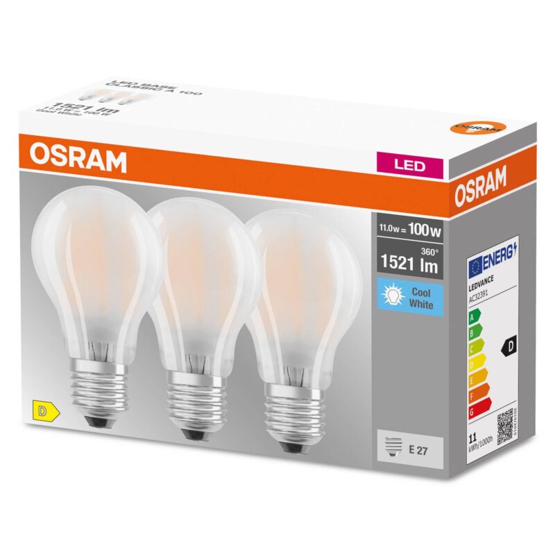 V hodnotnom balení 3 – matná LED žiarovka E27 11W pätica Classic A, univerzálna biela 4 000 K – nie je stmievateľná