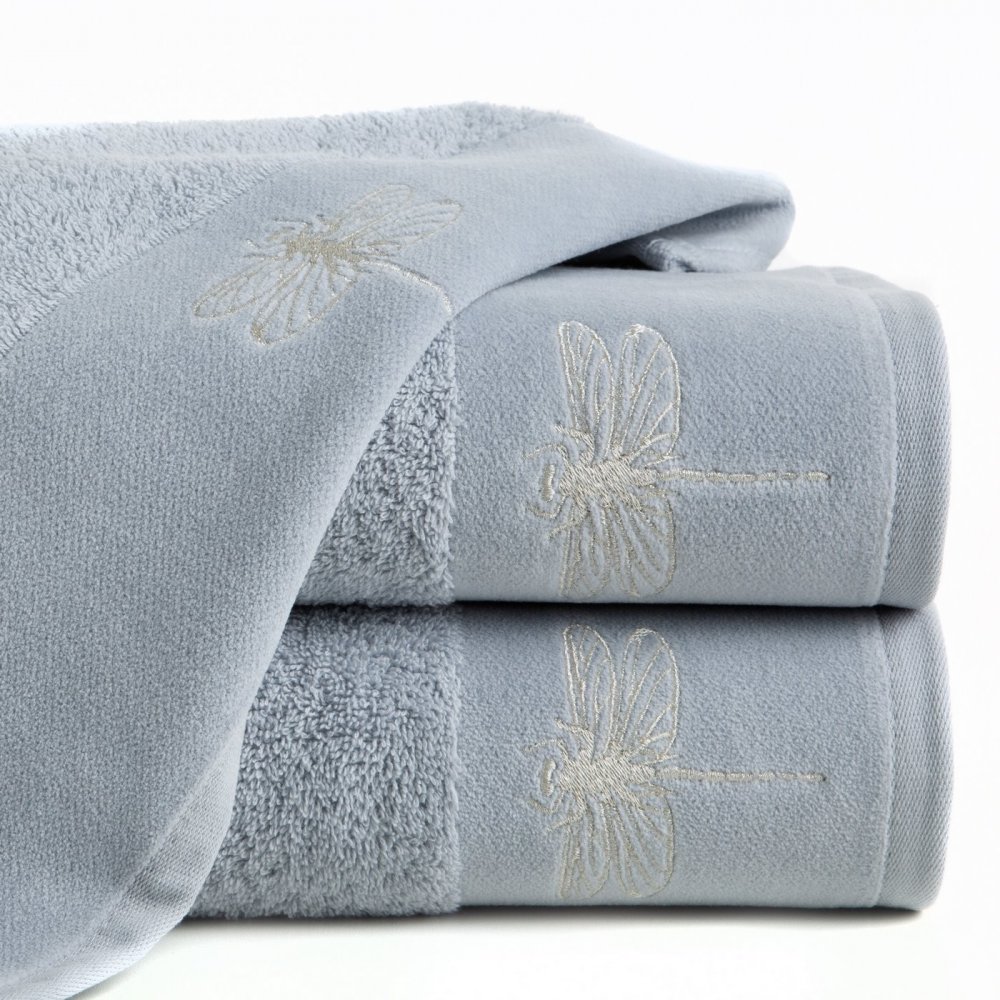 Osuška v modro-sivej farbe s výšivkou vážky prešívanou striebornou niťou Šírka: 50 cm | Dĺžka: 90 cm