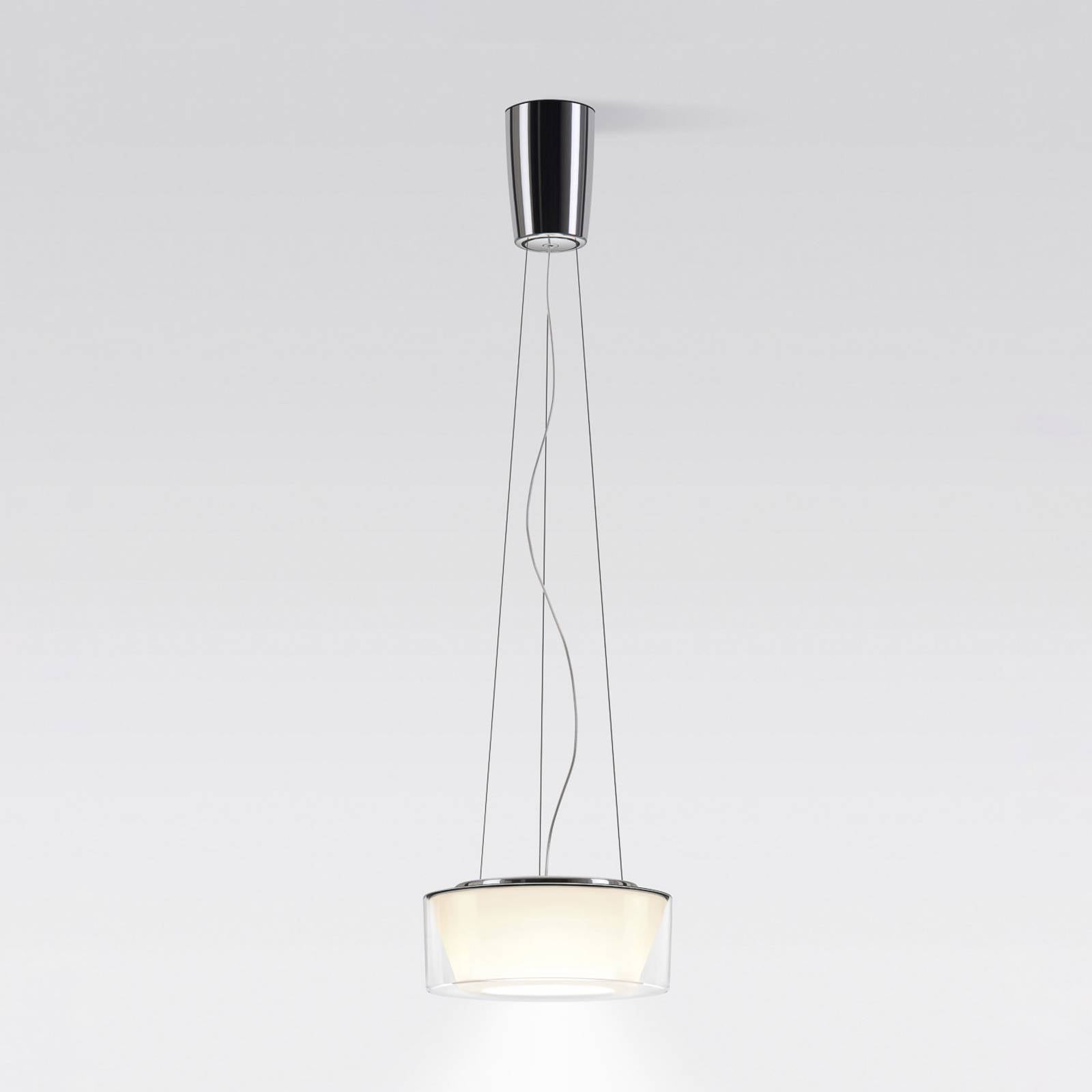 Inovatívne závesné svietidlo Curling LED s akrylovým tienidlom a kužeľovým reflektorom, stmievateľné, teplá bielaZávesné svietidlo Curling LED je skutočným zážitkom, a to po vizuálnej aj technickej stránke. Jeho dizajn, inšpirovaný curlingovými kameňmi z rovnomenného zimného športu, vytvorili Jean-Marc da Costa a Manfred Wolf, ktorí založili výrobcu serien.lighting a pôsobia ako jeho konatelia.Táto verzia obsahuje tienidlo z akrylu, ako aj kónický vnútorný reflektor z opálového polykarbonátu. Týmto spôsobom sa teplé biele svetlo s vynikajúcim podaním farieb jemne šíri nahor a do strán. Intenzitu možno stlmiť externe pomocou triaku, a tak kedykoľvek nastaviť jas podľa požadovanej nálady. Na pripevnenie svietidla k vrchlíku s lešteným hliníkovým povrchom sa používajú tri laná z nehrdzavejúcej ocele.