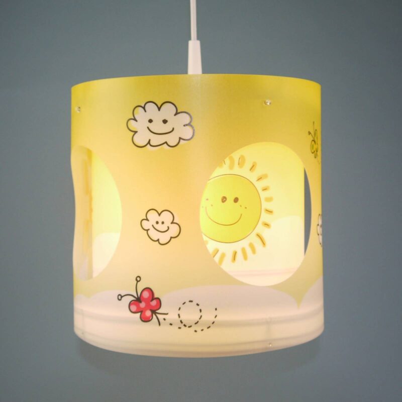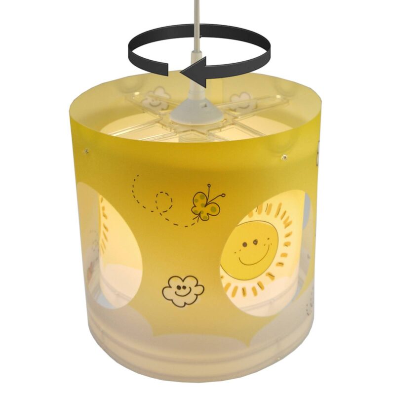 Žlté závesné svietidlo do detskej izby Sunny s otočným vnútorným tienidlom Slnečné žlté závesné svietidlo Sunny prináša do detskej izby pohyb. Vonkajší tienidlo na lampu je zdobený malými motýľmi a oblakmi za pekného počasia a má okolo seba štyri okrúhle vybrania. Na o niečo menší vnútorný tieň svietia smiechové slniečka. Vnútorná obrazovka je poháňaná solárnym tichým motorom, energia pre solárny modul pochádza zo svetelného zdroja. Vnútorné tienidlo sa ticho otáča, takže usmievavé slniečka presvitajú okrúhlymi otvormi vonkajšieho tienidla znova a znova. Sunny je lampa do detskej izby, ktorú si zamiluje každé dieťa – vyrobená v Nemecku.