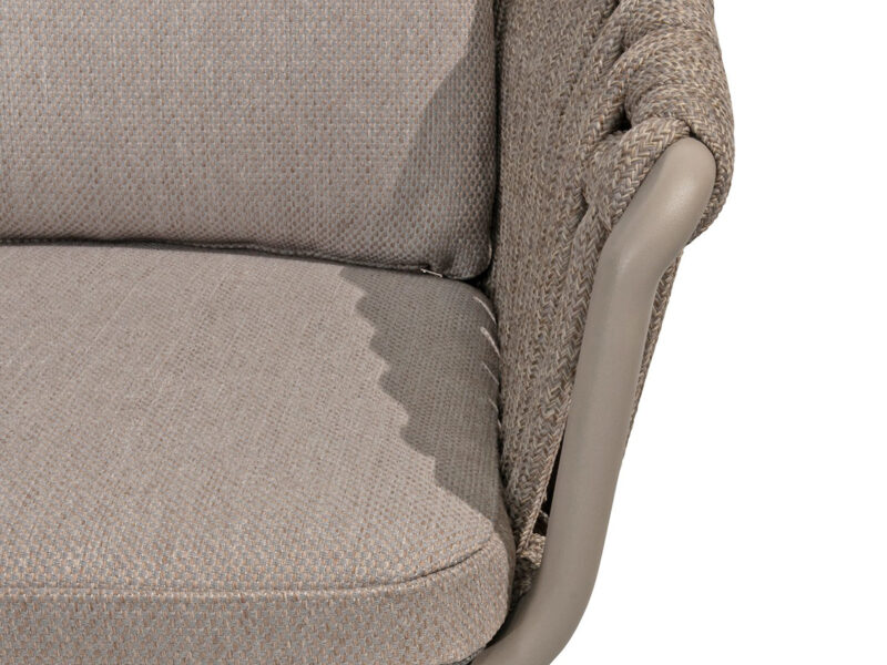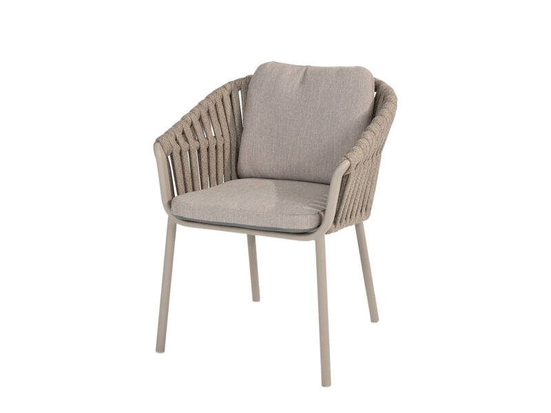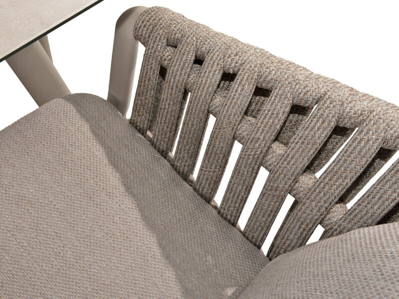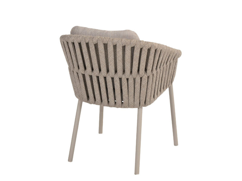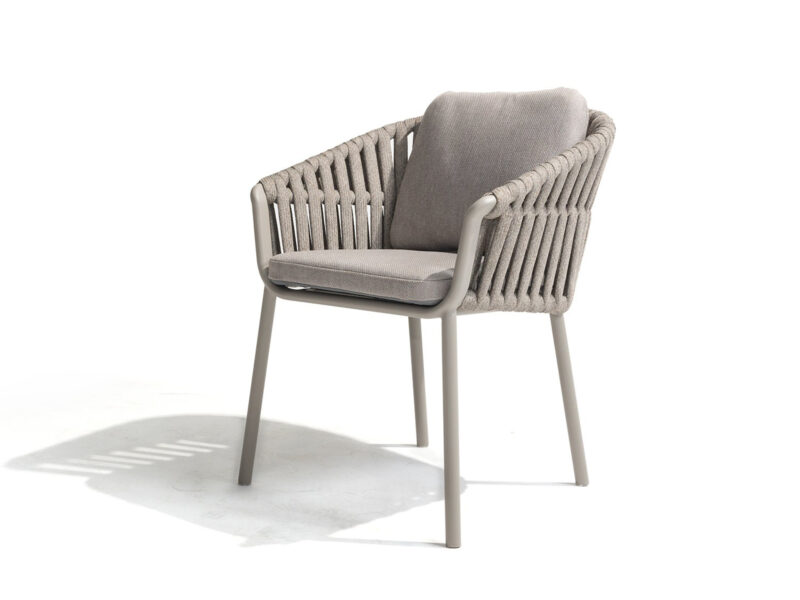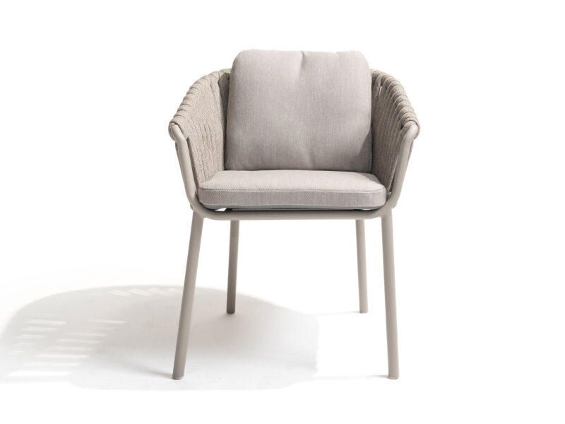 Owen jedálenská stolička kombinuje odolnosť a moderný štýl. Pevný hliníkový rám v odtieni cloud, opletený elegantným sivým lanom, dopĺňajú pohodlné sivé vankúše. Ideálne riešenie pre vašu záhradu či terasu.