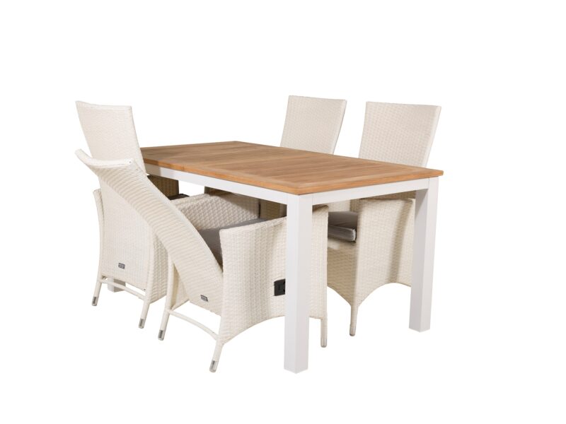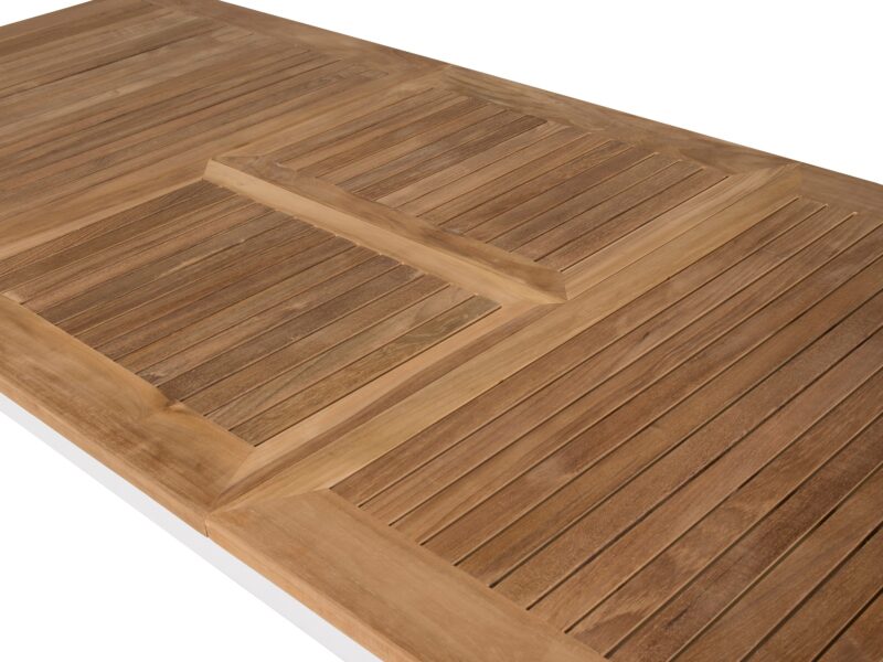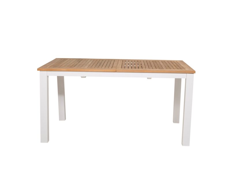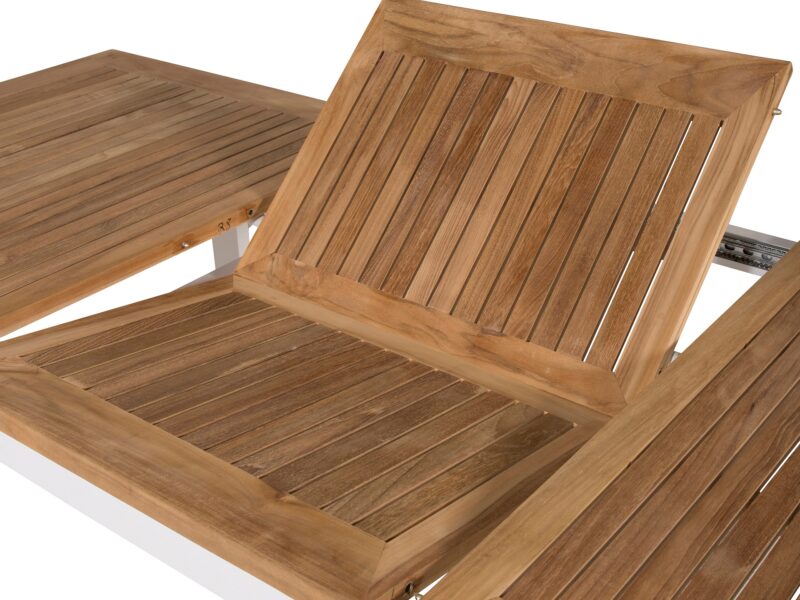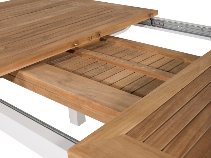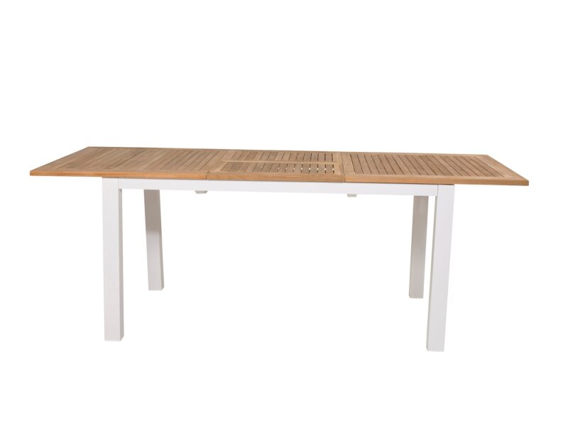 Očarujúci jedálenský rozkladací stôl Panama s teakovou stolovou doskou a bieleho kovového rámu je elegantným a odolným doplnkom pre vašu terasu.