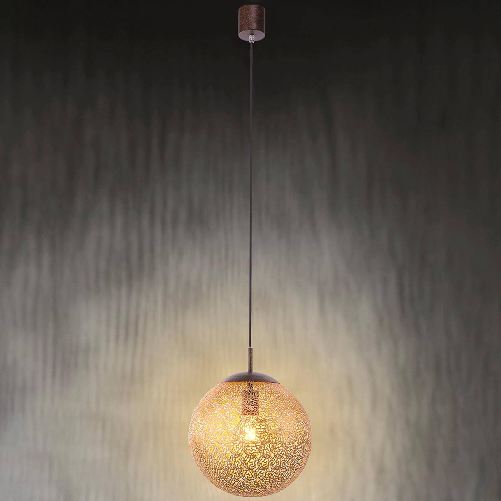 Greta – závesné svietidlo s guľovitým tienidlom s krásnym vzorom, 30 cm Kombinácia hrdzavohnedého lakovaného kovu vrchnáka a držiaka tienidla a guľovitého tienidla zlatej farby s krásnym priesvitným vzorom robí zo závesného svietidla Greta svetelný zdroj, ktorý nielen poskytuje príjemné osvetlenie, ale je aj krásnym dekoratívnym prvkom nad stolom. Veľmi atraktívne vyzerá aj niekoľko svietidiel – prípadne rôznych veľkostí – namontovaných v skupine. Závesné svietidlo Greta, ktoré je vybavené všetkými typmi svetelných zdrojov s päticou E27, poskytuje aj energeticky úsporné osvetlenie.