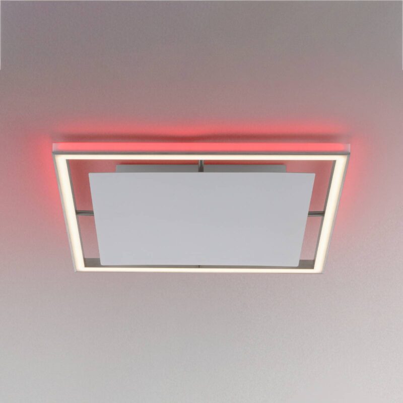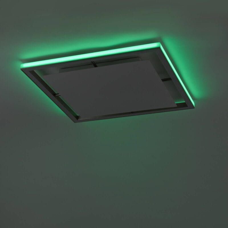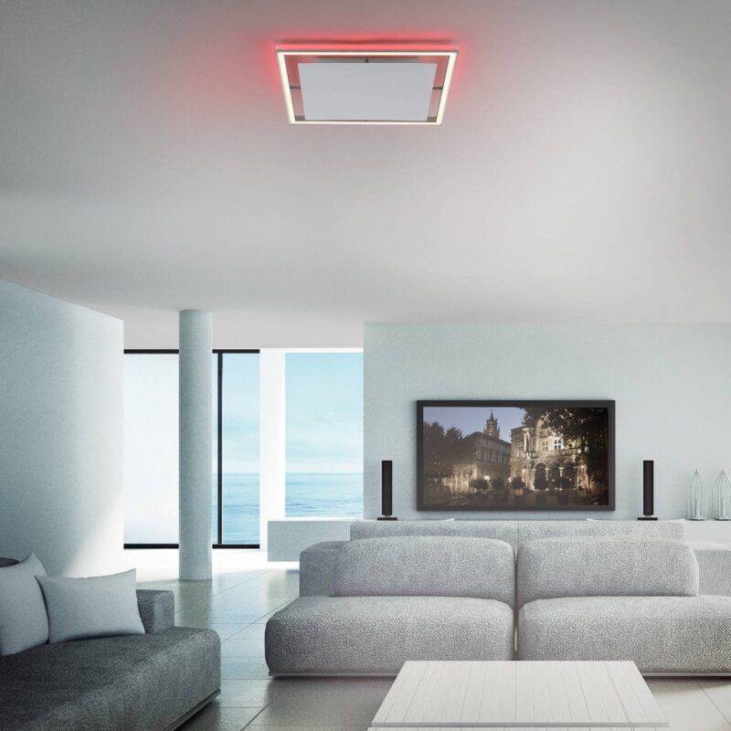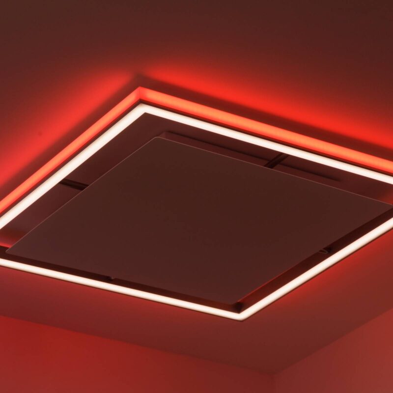 LED stropné svietidlo Helix s diaľkovým ovládaním, CCT a RGB osvetlením Toto štvorcové stropné svietidlo LED Helix je svetelným lákadlom na strope a jeho svetelný lúč sa dá flexibilne nastaviť. Svietidlo je vyrobené z hliníka a v úzkom ráme, ktorý obklopuje kovovú dosku v strede, je vybavené LED diódami smerom nadol aj do strán. Rôzne nastavenia možno upraviť pomocou diaľkového ovládania, ktoré je súčasťou dodávky. LED diódy vyžarujúce do strán svietia farebne (RGB) a môžu svietiť v ktorejkoľvek z viac ako 16 miliónov farieb, zatiaľ čo LED diódy vyžarujúce smerom nadol možno vďaka funkcii CCT prepínať na rôzne farby bieleho svetla, od teplej bielej až po denné svetlo. Svetlo možno stlmiť diaľkovým ovládaním, vybrať funkciu nočného svetla a mnoho ďalšieho.Zvolené nastavenie svetla sa uloží pomocou pamäťovej funkcie až do ďalšieho zapnutia.