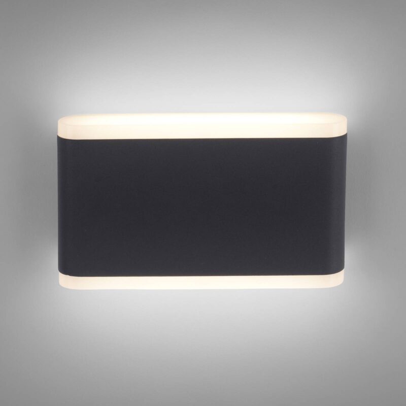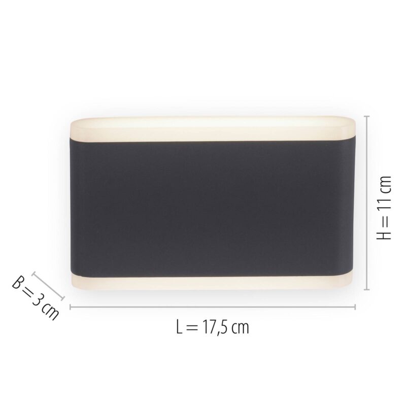 Vonkajšie nástenné svietidlo Elsa LED v antracitovej farbe s krytím IP65 Vonkajšie nástenné svietidlo Elsa LED v antracitovej farbe zaujme moderným obdĺžnikovým tvarom a zaoblenými hranami. Nástenné svietidlo z plastu zaujme svojím jednoduchým vzhľadom vo vašom vonkajšom priestore. Teplé biele svetlo vyžaruje mäkké, neoslňujúce svetlo smerom nahor a nadol. Nástenné svietidlo sa dodáva s dvoma svetelnými zdrojmi LED. Vďaka stupňu krytia IP65 je chránené proti vniknutiu prachu a prúdu vody, takže je vhodné na inštaláciu vo vonkajšom prostredí.
