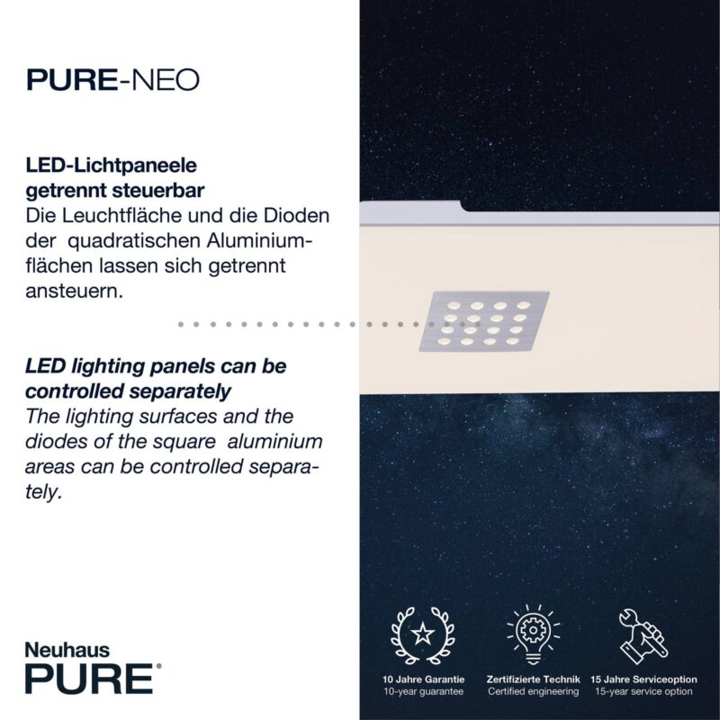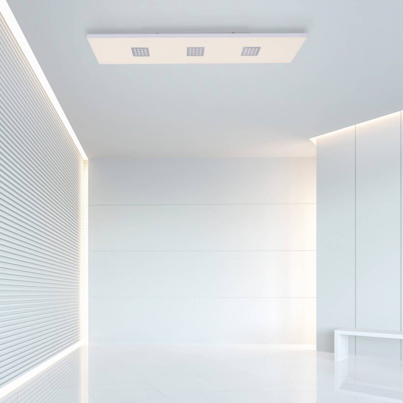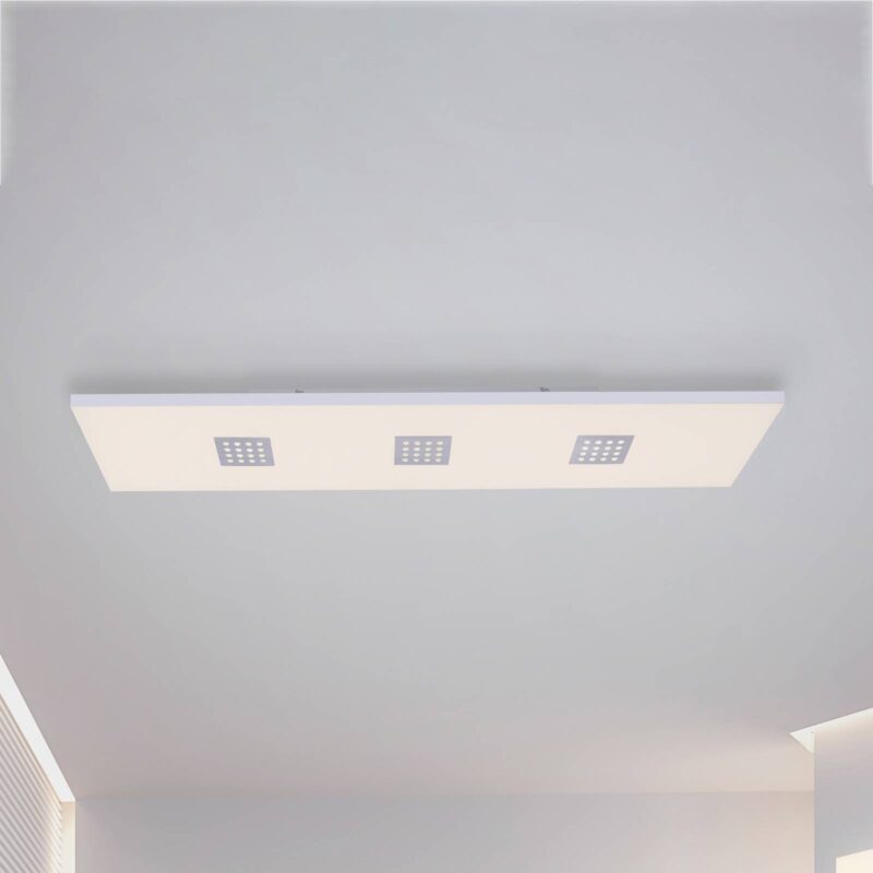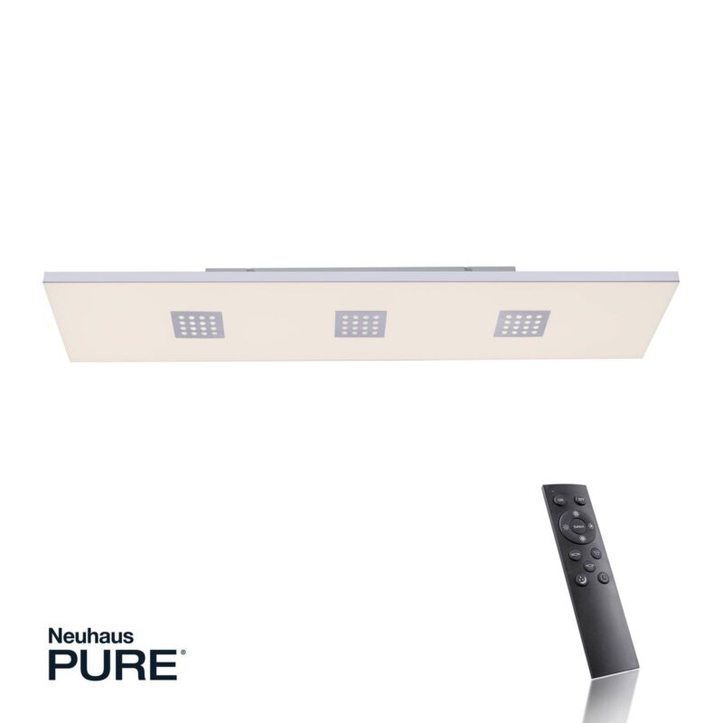 Obdĺžnikové stropné LED svietidlo Pure-Neo – flexibilne nastaviteľné s diaľkovým ovládaním Obdĺžnikový panel Pure-Neo LED ponúka flexibilne nastaviteľné osvetlenie vďaka funkcii CCT, ktorá ponúka výber farby svetla v rozsahu od teplej bielej až po univerzálne biele svetlo, plynulú reguláciu stmievania a samostatné možnosti spínania jednotlivých dosiek LED. Svietidlo sa dodáva s diaľkovým ovládačom, ktorým možno okrem nastavenia farby svetla a jasu aj samostatne spínať jednotlivé LED dosky. Takto sa dajú prepínať buď tri LED tabule s perforovanými hliníkovými krytmi, alebo tabuľa za satinovaným povrchom. Vďaka týmto variabilným nastaveniam svetla je možné svietidlo používať v rôznych miestnostiach a prispôsobiť ho každej situácii, či už ide o jasné pracovné osvetlenie alebo mäkké svetlo na príjemné večerné posedenie. Diaľkové ovládanie ponúka aj funkciu nočného svetla a časovač.