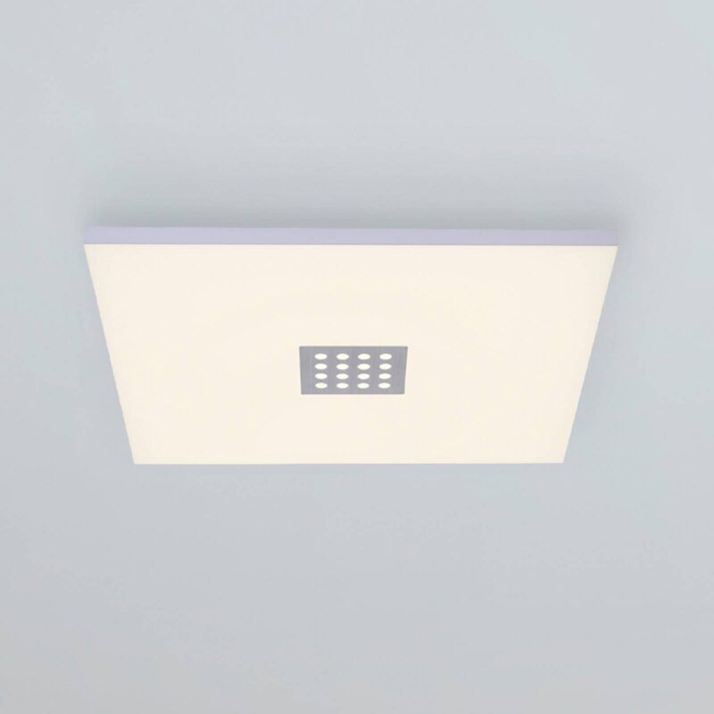 LED stropné svietidlo Pure-Neo vrátane diaľkového ovládania, stmievateľné a s funkciou CCT Plochý panel LED Pure-Neo v štvorcovom tvare je vyrobený z hliníka a PMMA a je vybavený funkciou CCT, čo znamená, že sa dá nastaviť farba svetla od teplej bielej po univerzálnu bielu. Panel je vybavený dvomi tabuľami LED, ktoré sa dajú samostatne prepínať – takže môže byť osvetlená len veľká plocha alebo len malá plocha uprostred, prípadne obe spolu. Či už ide o jasné osvetlenie na prácu alebo jemné osvetlenie na večerné sledovanie televízie – s panelom LED môžete kedykoľvek nastaviť správne osvetlenie. Nastavenie svetla možno pohodlne upraviť pomocou dodaného diaľkového ovládača, ktorý možno použiť aj na stlmenie svetla. Diaľkové ovládanie ponúka aj možnosť zapnutia nočného svetla a funkciu časovača.