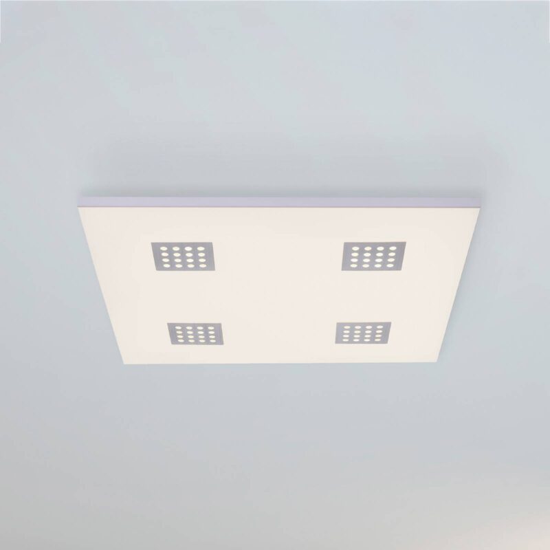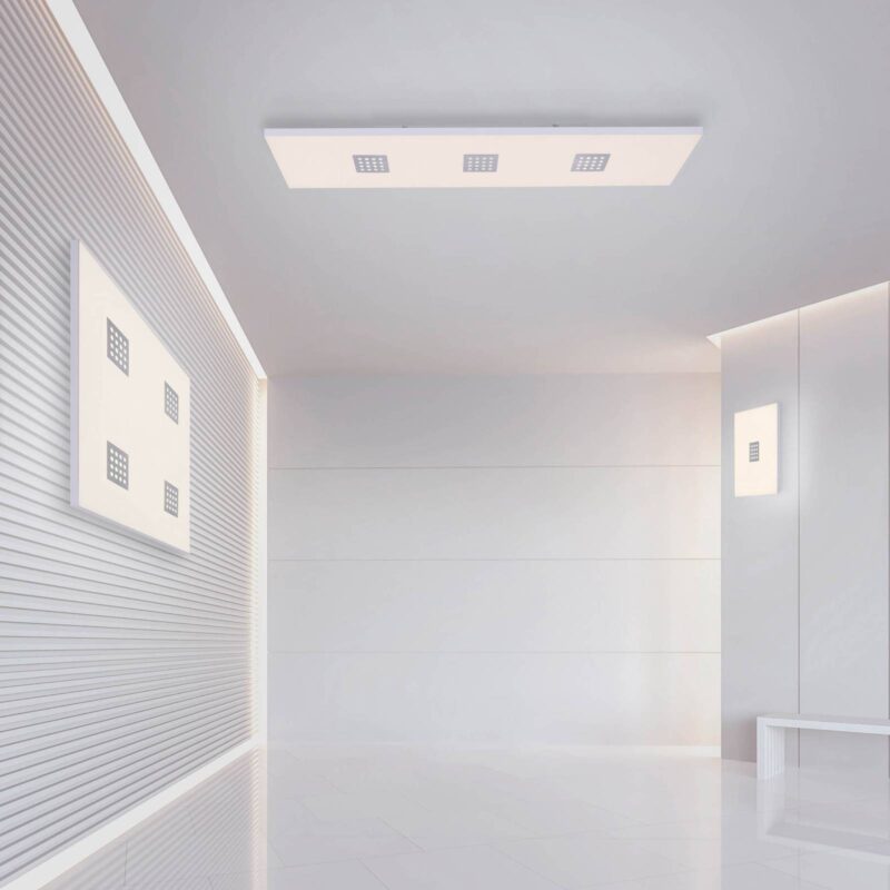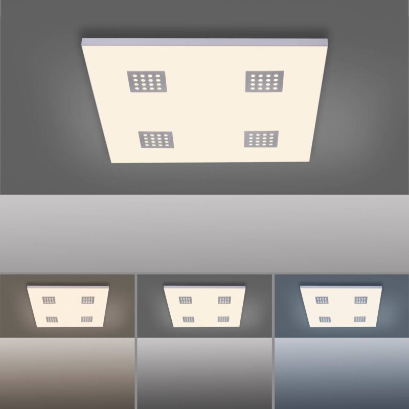 LED stropné svietidlo Pure-Neo s diaľkovým ovládaním, funkcia CCT Veľké, ploché stropné svietidlo Pure-Neo LED jasne a variabilne osvetľuje aj veľké miestnosti a možno ho pohodlne ovládať pomocou dodaného diaľkového ovládania. Panel je vyrobený z hliníka a PMMA a je vybavený tabuľkami LED, ktoré sa dajú zapínať samostatne – štyri tabuľky za perforovanými hliníkovými krytmi a tabuľka za satinovaným povrchom sa dajú zapínať samostatne. Farbu svetla možno zvoliť pomocou diaľkového ovládača, a to od teplej bielej až po univerzálne biele svetlo. Jas je možné plynule stmievať a je tiež možné vybrať, či má byť osvetlený len povrch, štyri svetelné body v strede alebo obidva spolu. Je možné nastaviť aj funkciu časovača a vybrať nočné svetlo.