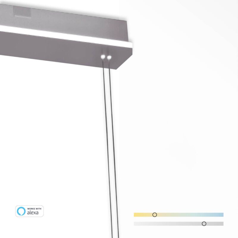 Závesné svietidlo Q-Etienne LED kompatibilné so ZigBee s nastaviteľnou výškouS závesným svietidlom Q-Etienne LED môžete nielen optimálne osvetliť jedálenské priestory, ale ich aj štýlovo doplniť. Dosiahne sa to kombináciou strieborného vrchlíka a štyroch tienidiel z opálového skla, ktoré sú k nemu pripevnené. Pomocou diaľkového ovládania, ktoré je súčasťou dodávky, možno zabudované moduly CCT LED stmievať, meniť teplotu svetla alebo tiež prepínať do rôznych scén, aby bolo možné kedykoľvek vytvoriť dokonalý svetelný moment. Vďaka integrovanému štandardu ZigBee je možné aj pripojenie k existujúcemu systému inteligentnej domácnosti, takže okrem hlasového ovládania je možné aj ovládanie prostredníctvom smartfónu alebo tabletu. Okrem toho je možné manuálne meniť výšku svetelnej lišty v rozsahu 120 – 200 cm. Technické údaje/kompatibilita:- stmievateľný- nastaviteľná výška od 120 – 200 cm- nastaviteľná teplota farieb od teplej bielej po univerzálnu bielu- pamäťová funkcia- ovládanie pomocou priloženého diaľkového ovládača- kompatibilný so ZigBee- priamo možné hlasové ovládanie pomocou Echo Plus a Echo Show (2. generácia)- po integrácii do systému inteligentnej domácnosti založeného na ZigBee aj pohodlné ovládanie pomocou aplikácie alebo hlasového príkazuPoznámka: Na integráciu do systému inteligentnej domácnosti je potrebný mostík; ten nie je súčasťou dodávky.