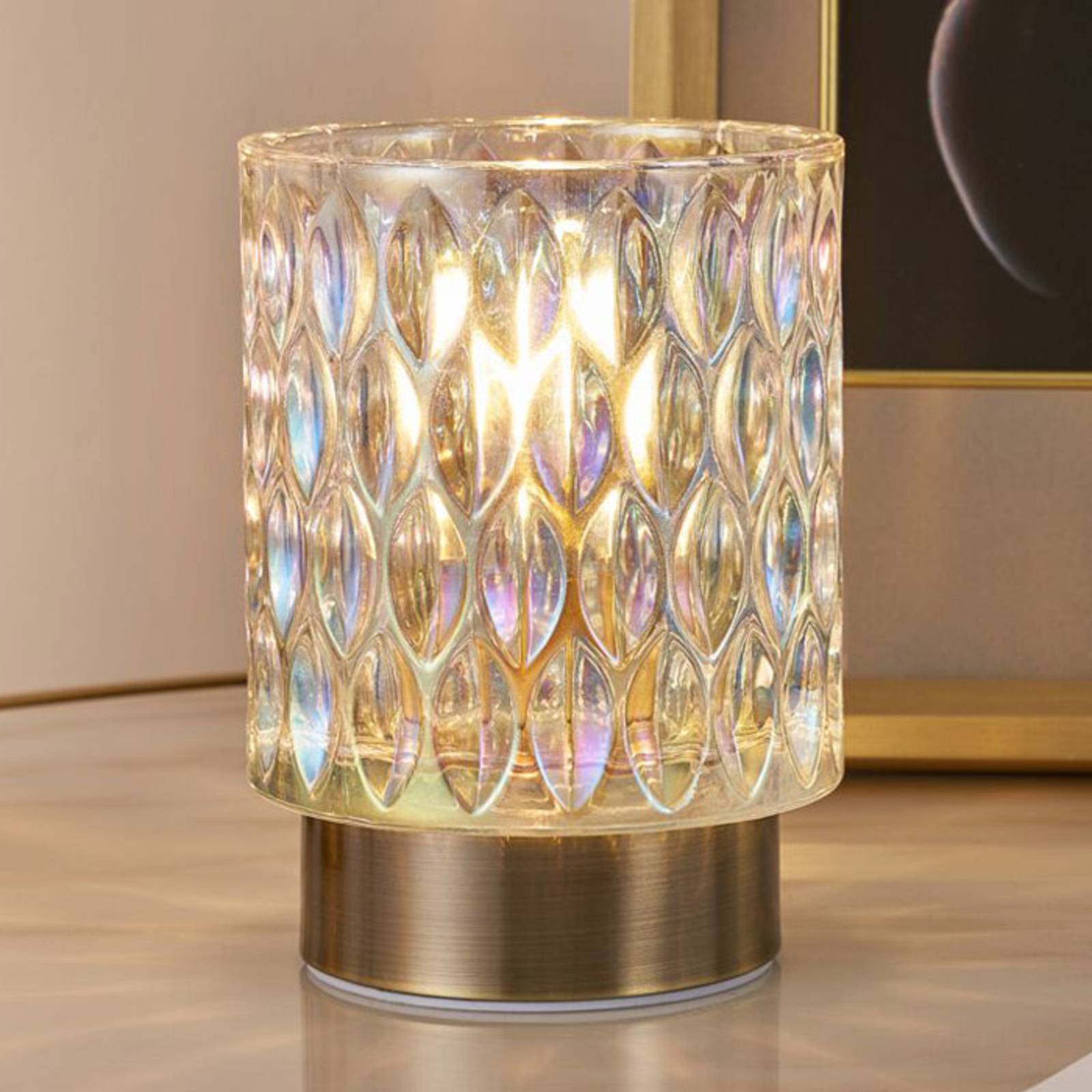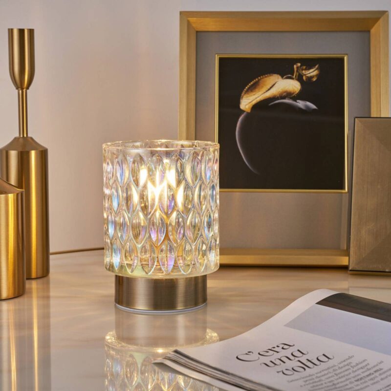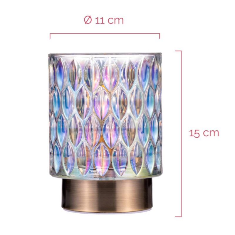 Mnohotvárna hra svetla: dekoratívna stolová lampa Clear Glamour LED s LED svietidlom Štýlová stolová lampa Clear Glamour LED Deco pozostáva zo základne z kovu s povrchovou úpravou z brúsenej mosadze a tienidla z dichroického skla. Vďaka tomu svetlo svieti rôznymi farbami v závislosti od uhla pohľadu. Súčasťou dodávky je aj príslušná LED žiarovka. Stolná lampa LED Clear Glamour je tiež skvelým čisto dekoratívnym prvkom. Môže sa použiť ako pútač pozornosti na komode, okennom parapete alebo pri spoločenskom stretnutí pri jedálenskom stole. Navyše nebezpečenstvo zakopnutia je s touto dekoratívnou lampou minulosťou, pretože je napájaná batériami, a teda sa zaobíde bez kábla. – Batérie: 3 x AA (nie sú súčasťou balenia) – Vhodná žiarovka je súčasťou dodávky; nie je vhodná pre bežné žiarovky E14 – vybavené časovačom (automaticky sa vypne po 6 hodinách)