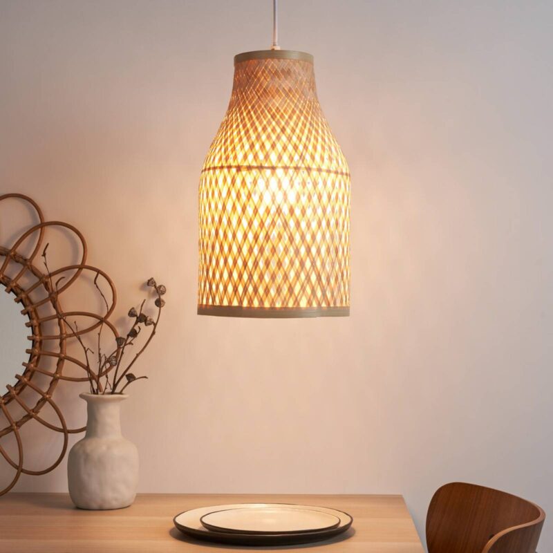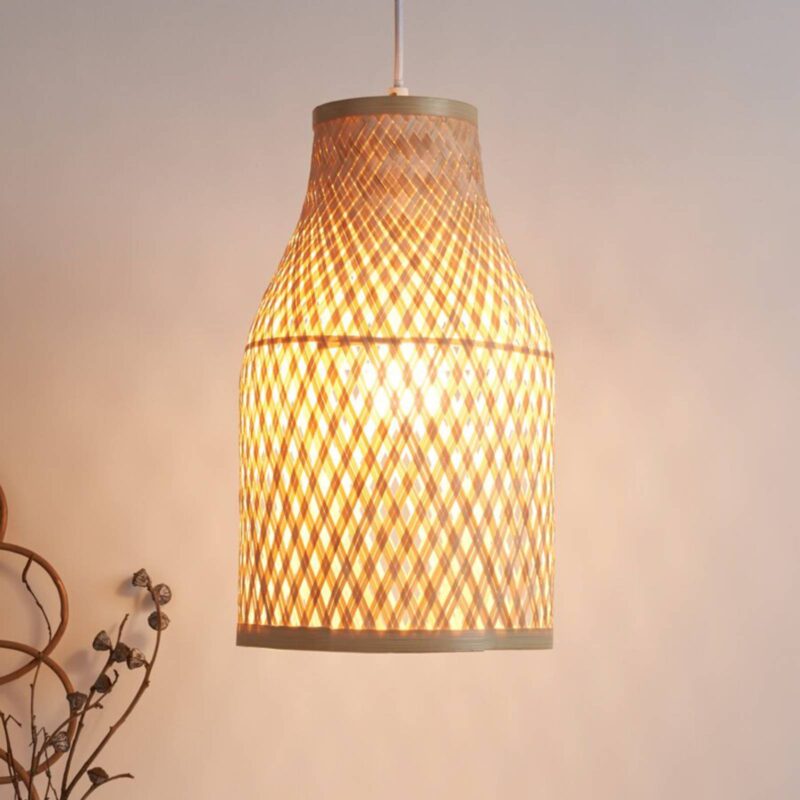 Závesná lampa Woody Romance s bambusovým tienidlom Tienidlo závesnej lampy Woody Romance pripomína tvar fľaše alebo vázy. Skladá sa z bambusovej sieťoviny a visí z okrúhleho baldachýnu na textilom potiahnutom kábli. Mnohé malé medzery medzi bambusovými okami umožňujú svetlu žiarovky presvitať a vytvoriť veľmi krásnu svetelnú atmosféru so skvelými efektmi. Lampa vnáša prirodzenosť a útulnosť do každej domácnosti a hodí sa nielen nad stôl, kde sa dá veľmi pekne zavesiť aj v niekoľkých kópiách.