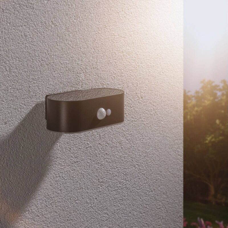 LED solárne vonkajšie nástenné svietidlo Adya v čiernej farbe so senzormi Vďaka solárnemu panelu na hornej strane svietidla možno oválne vonkajšie nástenné svietidlo Adya LED vyžarujúce smerom nadol používať všade tam, kde nie je k dispozícii elektrické pripojenie. Svietidlo vybavené teplými bielymi LED diódami vyžaruje svetlo smerom nadol a vďaka integrovanému snímaču pohybu sa zapína len vtedy, keď je potrebné svetlo. Solárny panel nabije integrovanú batériu za približne 8 hodín počas dňa. Ak sa zistí pohyb, svetlo sa automaticky zapne na 45 sekúnd. Snímač má detekčný uhol 110° a dosah 8 metrov.