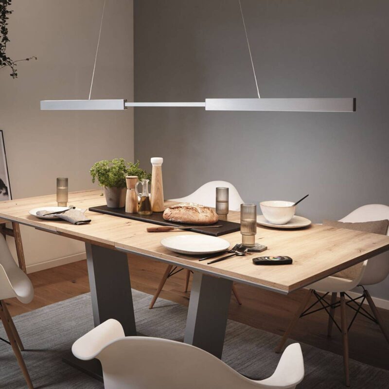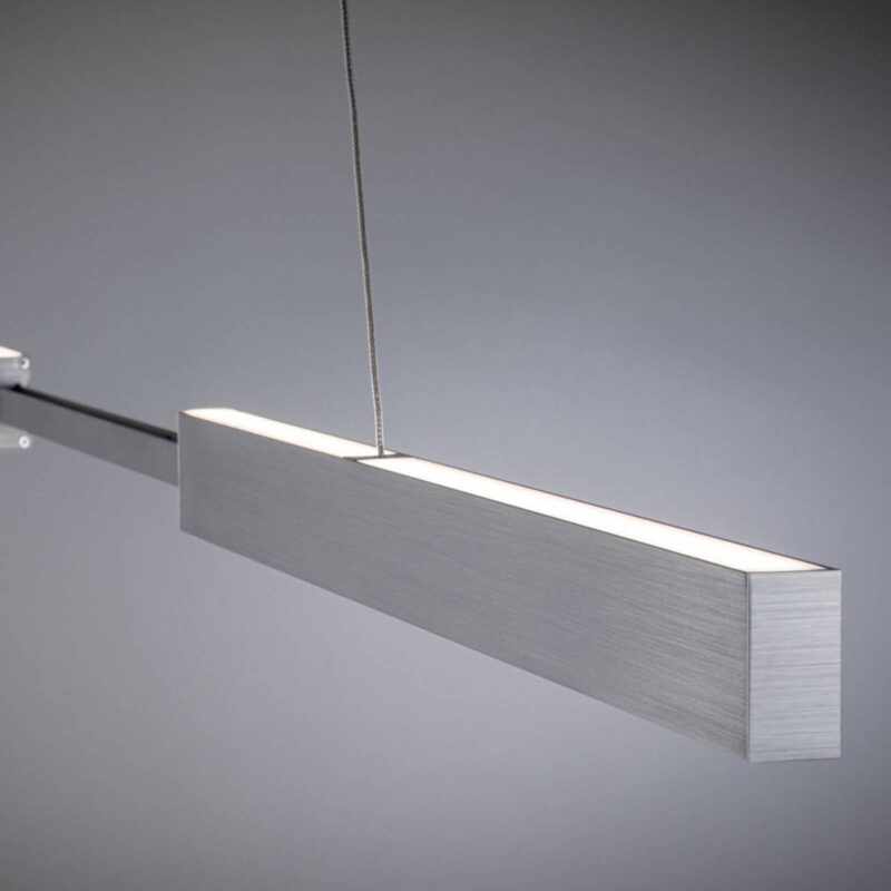 Inovatívne, ovládateľné LED závesné svietidlo Aptare, výškovo a dĺžkovo nastaviteľné Toto závesné LED svietidlo Aptare má množstvo praktických a pohodlných funkcií, vďaka ktorým je veľmi flexibilné a umožňuje jeho prispôsobenie priestorovým podmienkam a osobným potrebám. Okrem toho, že je výškovo nastaviteľný od 90 cm do 150 cm, je možné ho nastaviť aj vodorovne. Telo svietidla je možné predĺžiť z dĺžky 132 cm až na 180 cm. Takto sa vytvorí optické oddelenie zdroja svetla. Svetelný lúč je vyžarovaný priamo nadol a nepriamo nahor, čo je ideálne na osvetlenie jedálenského stola. Súčasťou dodávky je diaľkové ovládanie ZigBee Gent na ovládanie LED závesného svetla Aptare, ktoré umožňuje ovládanie bez mobilného zariadenia. Pomocou aplikácie Smart Friends Box a bezplatnej aplikácie pre Android a iOS možno svetlo ľahko ovládať pomocou smartfónu alebo tabletu a komunikovať s ostatnými komponentmi. Technické údaje / kompatibilita: – Vrátane rádiového diaľkového ovládania Paulmann ZigBee Gent (dosah až 20 m pod holým nebom) – alternatívne ovládateľné pomocou bezplatnej aplikácie Smart Friends (iOS alebo Android) prostredníctvom smartphonu alebo tabletu cez Paulmann Smart Friends Box – Kompatibilné s nasledujúcimi systémami: Amazon Alexa Echo Plus, Philips Hue Bridge 2 (okrem: Hue Entertainment), Osram SMART+ – rozšíriteľné o ďalšie produkty Smart Friends od rôznych výrobcov – Kompatibilné so ZigBee 3.0
