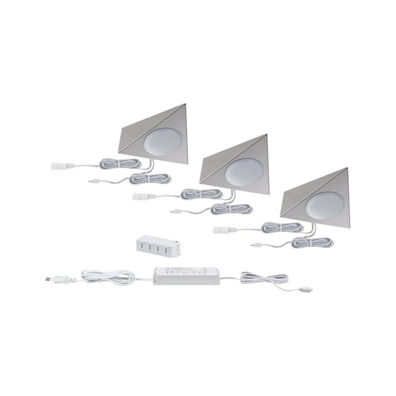 Trojdielna štartovacia sada LED nábytkové prisadené svetlá Clever Connect Trigo – pripravené na pripojenie Táto vopred zostavená štartovacia sada Clever Connect Trigo obsahuje tri trojuholníkové LED svetlá, transformátor s pripojovacím káblom a pripojovacím káblom a rozdeľovač. Môže byť inštalovaný bez ďalšieho príslušenstva a zaisťuje jas napríklad pod kuchynskou skrinkou na pracovnej ploche. Svetlá spodnej skrinky je možné prepínať na rôzne farby svetla pomocou laditeľnej bielej funkcie. K tomu je nevyhnutný spínač Switch Bowl, ktorý je možné objednať ako príslušenstvo. To umožňuje výber farba svetla v rozmedzí od teplého bieleho svetla na svetlo v farba svetla denne svetlo a tiež stmievanie svetla v akejkoľvek zvolenej farba svetla. Bez misky Switch Bowl svietia svetlá spodnej skrinky iba vo farba svetla denného svetla.