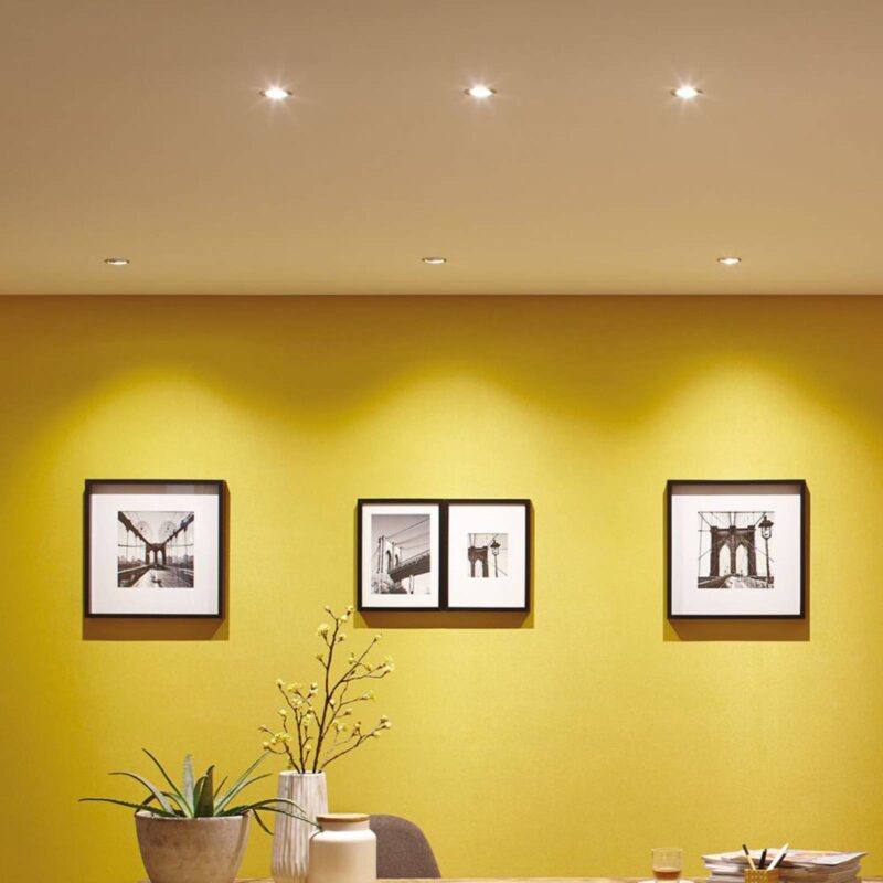 Stmievateľné, okrúhle LED zapustené bodové mince Slim v sade 3 kusov Chrómované zapustené bodové svetlo LED je dodávané v praktickej sade 3 kusov a zaujme jednoduchým moderným vzhľadom. Cez matné ochranné sklo, ktoré je obklopené lesklým hliníkovým rámom, vyžaruje teplé biele svetlo bez oslnenia. Svetelný lúč je možné optimálne vyrovnať otočením mince o 50 ° a cielene tak osvetliť konkrétne objekty alebo oblasti. Veľmi plochý dizajn zabudovaných bodových svetiel umožňuje inštaláciu v dutinách iba 3 cm a spojenie jednotlivých svetiel s rýchloupínacími svorkami znamená, že inštalácia je rýchla a bez použitia nástrojov. – dá sa otočiť až o 50 ° – stmievateľné pomocou RC Busch – Jäger 6513U-102, RC Merten MEG 5136-0000, RLC Müller Paladin 873 030 LED
