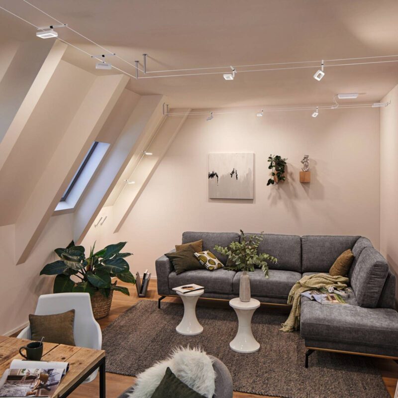 LED káblový systém Rámček ako kompletná súprava piatich svietidiel, kábla a transformátora Systém Frame wire sa dodáva pripravený na pripojenie ako kompletná súprava pozostávajúca z kábla, transformátora a piatich štvorcových svietidiel. Jednotlivé svietidlá, navrhnuté ako obdĺžnikové rámy, možno nielen umiestniť kdekoľvek na drôte, ale možno ich aj otáčať a nakláňať, takže jednotlivé svietidlá môžu svietiť rôznymi smermi. Vďaka tomu je drôtový systém ideálnym svietidlom pre dlhé chodby alebo šikmé miestnosti. Systém Frame wire možno namontovať na strop, ale aj na šikmú strechu alebo na stenu. Je vybavená energeticky účinnými, teplými bielymi diódami LED, a predstavuje tak moderný a energeticky úsporný zdroj svetla na základné osvetlenie miestnosti.