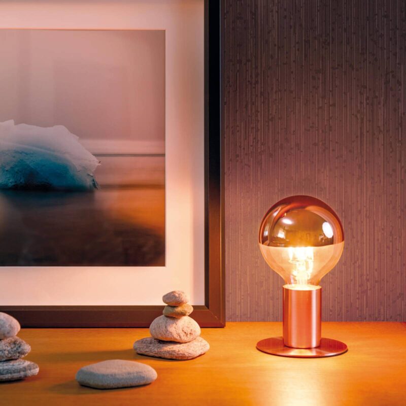 E27 6,5W LED žiarovka G95 so zrkadlovou hlavou medená Vintage alebo industriálna, škandinávska alebo moderná – LED žiarovka so zrkadlovou hlavou v módnej farbe medi postaví každý štýl interiéru do správneho svetla. Guľa s priemerom 9,5 cm vyzerá obzvlášť dobre v dekoratívnych a klietkových svietidlách. Je však aj skutočným lákadlom pre otvorené závesné alebo stropné svietidlá. Technické údaje – porovnávacia hodnota 48 W – 50 000 spínacích cyklov – nie je stmievateľné