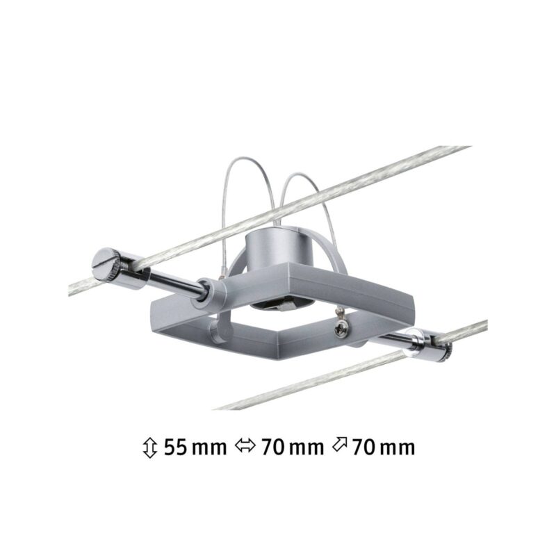 Príslušenstvo pre káblový systém Mac II – bodové v matnom chróme Káblový systém Mac II je možné rozšíriť pomocou tohto jediného svietidla. Spot má štvorcový tvar a je vyrobený z kovu a plastu. Povrch má matný chrómovaný povrch. Svietidlo musí byť vybavené vhodným zdrojom svetla, ktorý dokáže individuálne osvetliť miestnosť sklopením miesta.