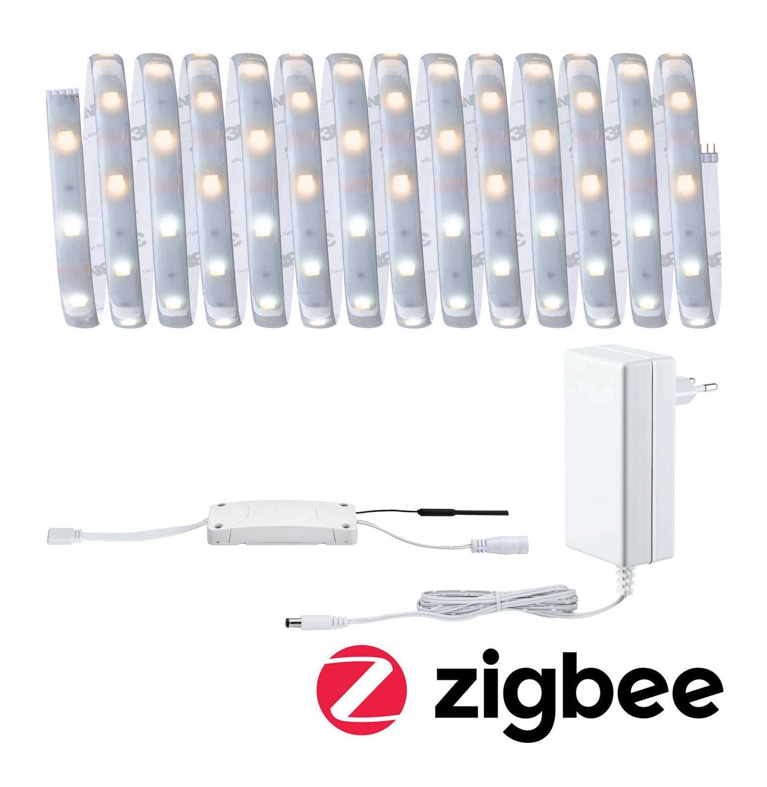 Základná sada kompatibilná so ZigBee: LED pás MaxLED 250 s napájacou jednotkou a ovládačom, zmena farby CCT, stmievateľná Tí, ktorí už prevádzkujú systém Smart Home založený na ZigBee, môžu túto základnú sadu LED pásu MaxLED 250 integrovať priamo a inteligentne ovládať všetky funkcie. Inak je mostík od spoločnosti Paulmann k dispozícii samostatne prostredníctvom príslušenstva: smik gateway vrátane bezplatnej aplikácie pre iOS a Android. Po integrácii je možné MaxLED prepínať prostredníctvom smartfónu alebo hlasového asistenta (Amazon Alexa), stmievať jas a meniť teplotu farieb. Alternatívou ku klasickému mostíku je takzvaný ručný vysielač ZigBee od spoločnosti Paulmann. V tomto prípade je k dispozícii 2-gangový nástenný vypínač aj diaľkové ovládanie Gent, s ktorým je možné ovládanie bez mostíka. Tieto produkty sú k dispozícii aj ako príslušenstvo. Rýchlu a jednoduchú inštaláciu zabezpečujú aj zásuvné spoje a samolepiaca spodná strana. Vďaka stupňu krytia IP44 je MaxLED chránený aj proti striekajúcej vode. Technické vlastnosti / kompatibilita: – Kompletná sada vrátane LED pásu a napájacej jednotky – Možnosť rozšírenia (pozri príslušenstvo) – ZigBee 3.0 kompatibilný – kompatibilný s diaľkovým ovládaním a nástenným vypínačom Paulmann Smart Home (pozri príslušenstvo) – kompatibilný so systémami Smart Home založenými na ZigBee, ako sú Philips Hue alebo IKEA Tradfri – stmievateľný a s nastaviteľnou teplotou farieb (po integrácii do systému Smart Home) – lepidlo na zadnej strane, zásuvný systém pre jednoduchú inštaláciu a možnosť skrátenia podľa potreby – flexibilný materiál na použitie na rovných alebo zakrivených povrchoch Poznámka: Na použitie inteligentného ovládania svetla (stmievanie, CCT, ovládanie cez aplikáciu atď.) je potrebný samostatný LED pásik ZigBee.), je bezpodmienečne potrebný samostatný mostík ZigBee alebo ručný vysielač ZigBee (pozri príslušenstvo)