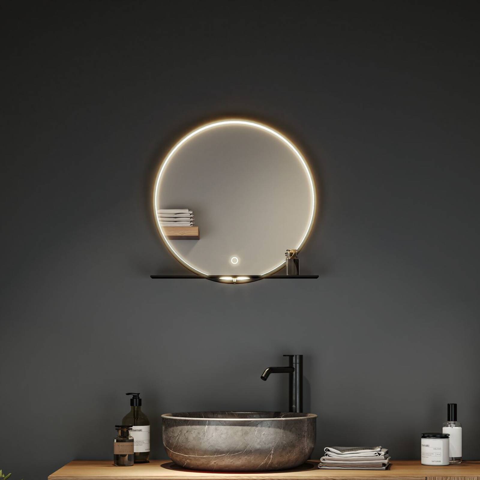 Paulmann Miro LED nástenné zrkadlo CCT Ø50cm Framelight s dotykovým ovládacím panelom pre individuálne ovládanie osvetlenia Paulmann Miro LED nástenné zrkadlo kombinuje moderný dizajn s inovatívnou funkčnosťou. Vyrobené z vysoko kvalitného kovu v elegantnej čiernej farbe, sa bezproblémovo hodí do moderných kúpeľní. Integrovaný LED svetelný zdroj ponúka pôsobivé podanie farieb 90 Ra a zaisťuje jasné, prirodzené osvetlenie. Vďaka funkcii CCT je možné plynule nastavovať farbu svetla od teplé bielej (2 700 K) až po bielu podobnú dennému svetlu (6 500 K) – ideálne pre rôzne nálady a požiadavky. Za zmienku stojí intuitívny dotykový ovládací panel, ktorý umožňuje nielen stmievanie svetla, ale aj presné nastavenie farby svetla. Praktická odnímateľná polička dopĺňa zrkadlo a ponúka dodatočný komfort. Nástenné zrkadlo Paulmann Miro LED spája funkčnosť a estetiku a stáva sa tak štýlovým prvkom každej kúpeľne.