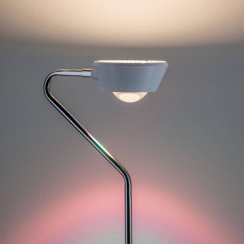Stmievateľná stojacia lampa Ramos LED s vypínačom Stojacia lampa Ramos LED sa dokonale hodí do každej moderne zariadenej miestnosti. Ohyb kovového stojana, ako aj 355° otočná bodová hlava svietidla rýchlo upútajú pozornosť pozorovateľa. Bodová hlava sa skladá z bieleho plastového krúžku, ktorý obklopuje sklenenú šošovku s LED diódami. Svetlo môže vyžarovať smerom nahor a nadol a nanesením dichroickej fólie (súčasť dodávky) na spodnú stranu sklenenej šošovky sa vytvoria špeciálne svetelné akcenty. Ramos je vybavený zástrčkou a vypínačom vrátane krokového stmievača a predstavuje optimálne doplnkové osvetlenie v miestnosti.