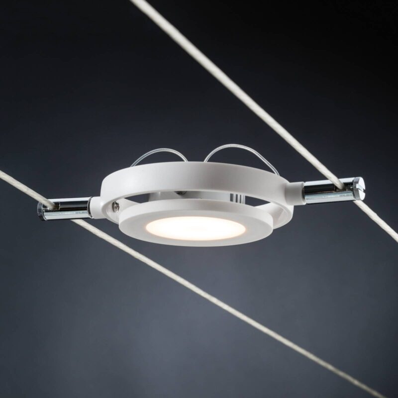 Praktický lankový systém MacRound z kovu Štýlový lankový systém s lankami v dĺžke približne 5 metrov sa osvedčil ako praktický na montáž v rôznych miestnostiach. Montáž systému pod stropom je pohodlná. Pozdĺž systému sa zoradia malé bodové svetlá. Posúvajú sa pozdĺž paralelného lanka. K dispozícii je okrúhly rám, ktorý umožňuje otáčanie bodového svetla v rámci osi. Tento praktický systém má šesť bodových svetiel. Umiestnenie a nastavenie bodových svetiel umožňuje široké spektrum svetelných nálad v miestnosti, ktoré sa zameriavajú na jednu oblasť alebo šíria svetlo do mnohých oblastí miestnosti. Osvetlenie je pritom jasné a predsa pohodlné, pretože svetlá nesvietia do miestnosti príliš oslnivo.
