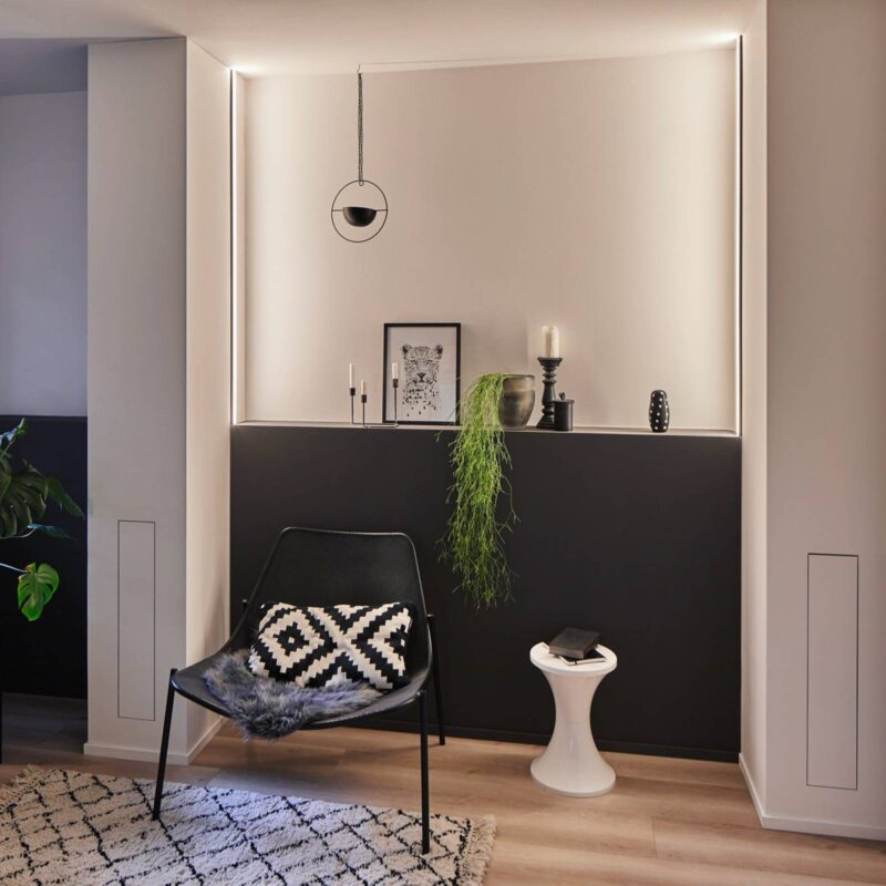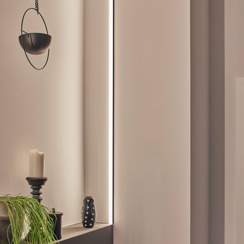 Povrchová montáž Štvorcový profil v matnej čiernej farbe pre pás Max LED Štvorcový profil na povrchovú montáž poskytuje dekoratívne svetelné efekty na stenách alebo nábytku. Úzky profil je vyrobený z robustného hliníka a je vybavený LED pásikom MaxLED 1000 (treba zakúpiť samostatne). Biely difúzor zaisťuje, že svetlo príjemne neoslňuje a homogénne vyžaruje do okolia, čím vytvára dekoratívny svetelný pás. Profil sa ľahko upevňuje pomocou držiakov a vďaka vysokokvalitnému eloxovaniu je povrch profilu mimoriadne odolný voči poškriabaniu. – Možnosť všestrannej montáže – Profil je možné podľa potreby skrátiť – kompatibilný s MaxLED 1000